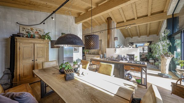 Der sehr große Wohnbereich trennt sich unter dem offenen Dachstuhl durch einen zentral situierten Kachelofen in den Essbereich mit der Kochinsel und in die Lounge.