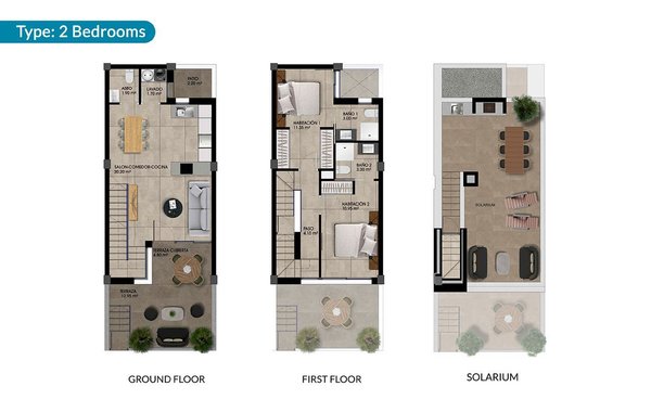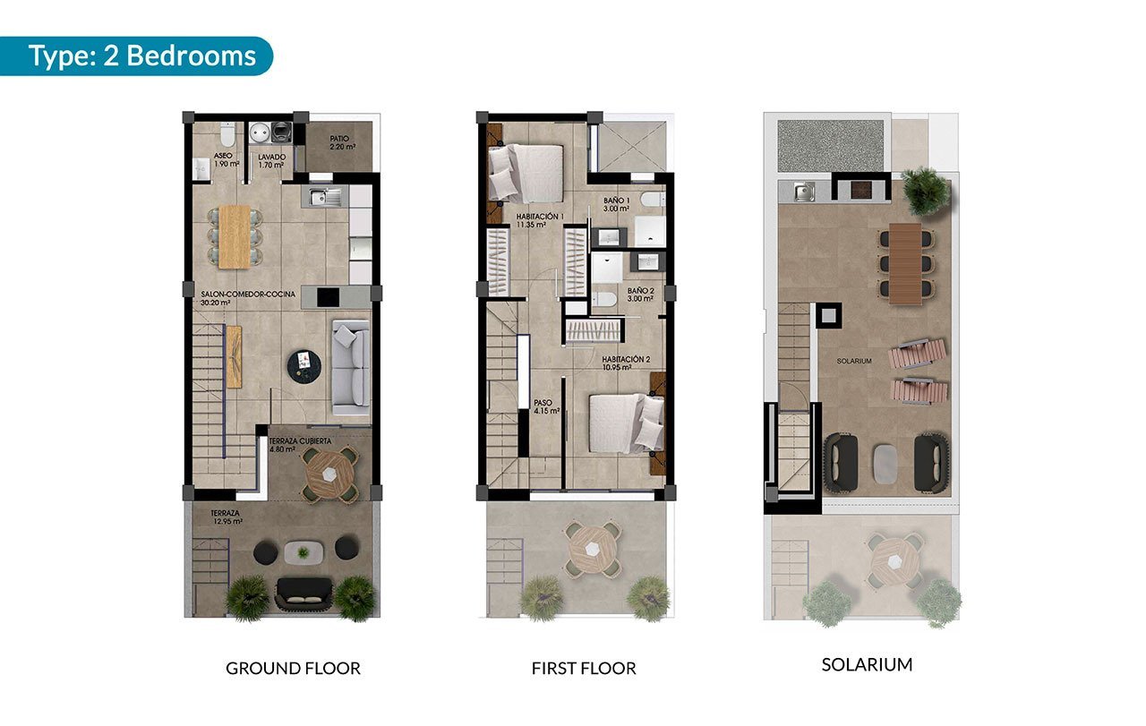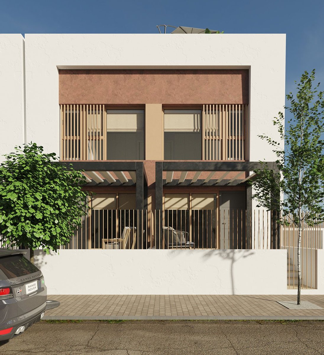 Elegante Reihenhäuser mit 2 Schlafzimmern, 2 Bädern, Gäste-WC, Dachterrasse, Vorinstallation Klimaanlage, Gemeinschaftspool und Kfz-Stellplatz