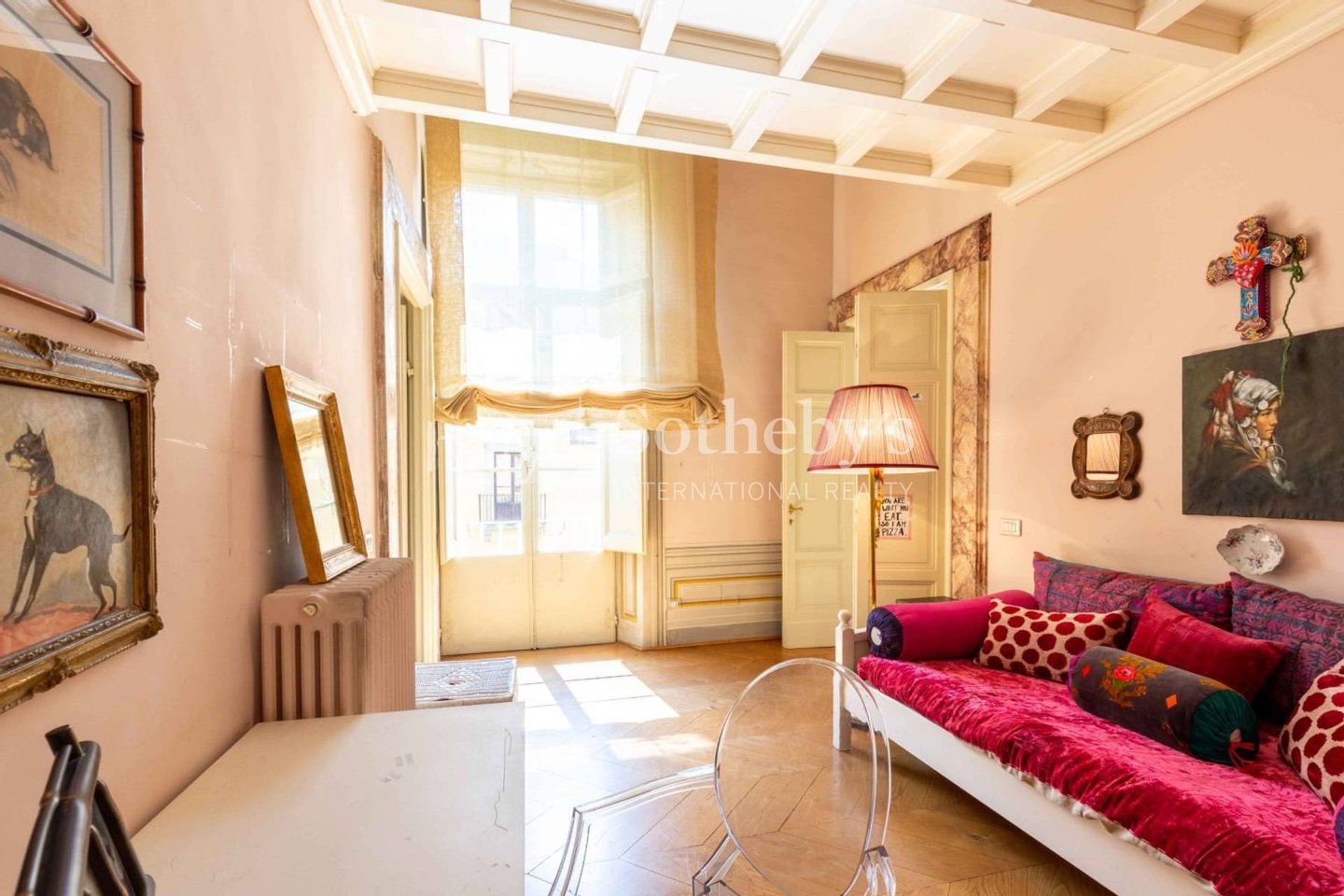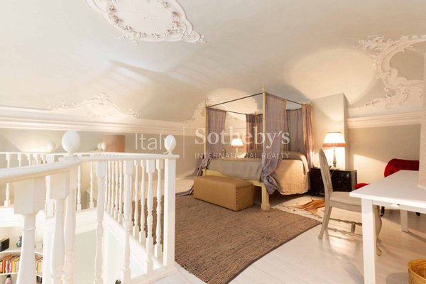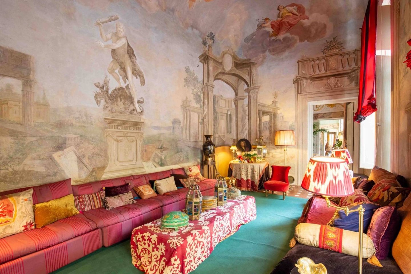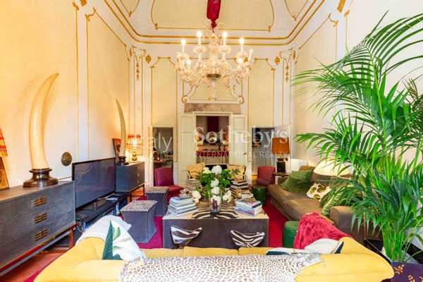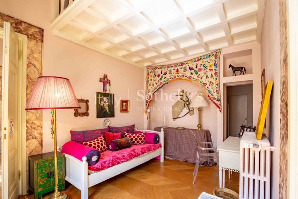 Der Eingang führt in ein großes, mit Fresken versehenes Wohnzimmer, das authentische Herzstück der Wohnung, das sofort durch seinen Charme und seine Einzigartigkeit beeindruckt.