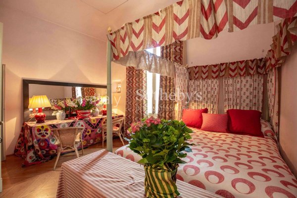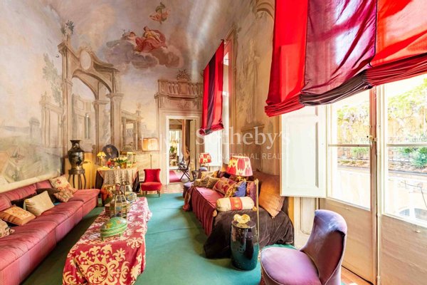 Der Eingang führt in ein großes, mit Fresken versehenes Wohnzimmer, das authentische Herzstück der Wohnung, das sofort durch seinen Charme und seine Einzigartigkeit beeindruckt.