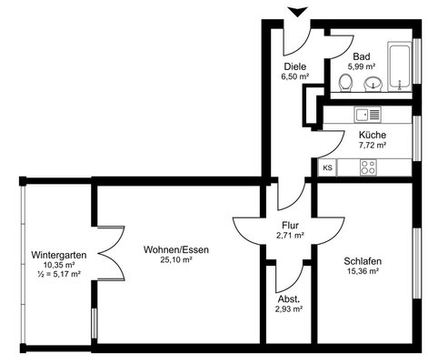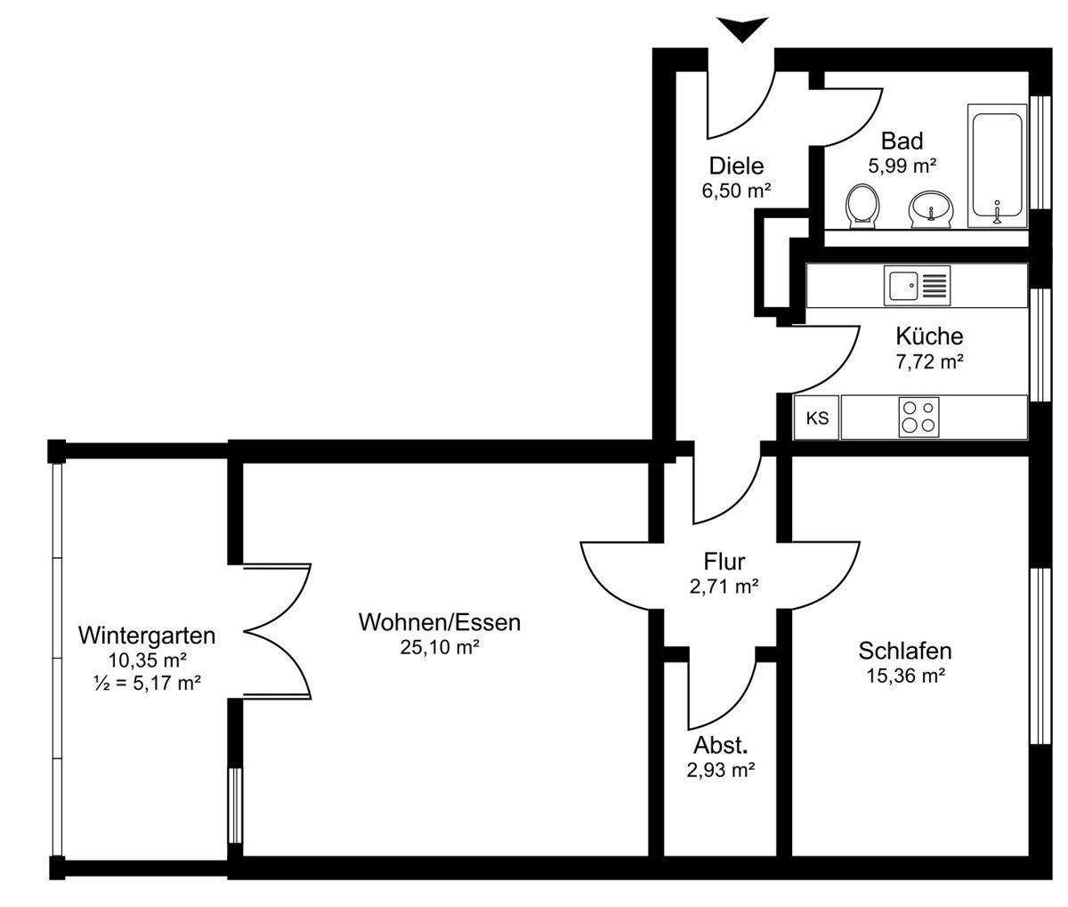 - ca. 76 m² Wohnfläche mit zwei Zimmern, Wintergarten, Bad, Küche und Abstellraum