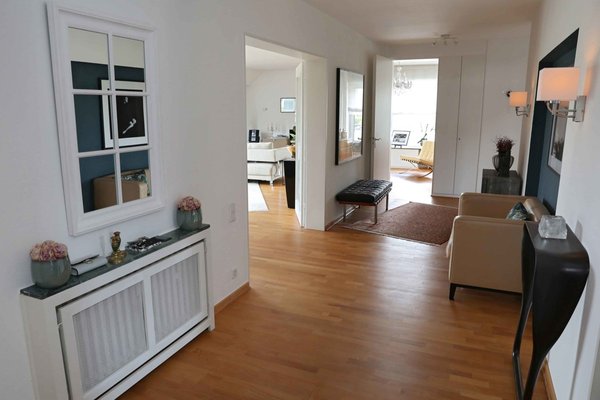 Die stilvolle, modernisierte 3,5 Zimmerwohnung befindet sich in der 2. Etage eines freistehenden Hauses mit nur 5 Wohneinheiten. Sie erreichen die Wohnung über das gepflegte Treppenhaus. Vom großzügigen Entrée mit Einbauschrank und Gäste-WC, erreichen Sie über eine 2-flügelige, verglaste Tür den weitläufigen Wohn- und Essbereich. Große Fensterfronten, ein hochwertiger Parkettboden sowie umlaufende Decken-Stuckprofile unterstreichen das stilvolle Wohnambiente. Vom Wohn- und Essbereich haben Sie Zugang zu 2 Terrassen in Nord-West und Nord-Ost Ausrichtung mit traumhaftem Fernblick. Die große Terrasse verfügt über eine elektrische Markise. Die Küche grenzt direkt an den Essbereich. Sie ist mit einer hochwertigen Nolte Einbauküche und Elektrogeräten von Siemens ausgestattet. Sie bietet ausreichend Platz für einen kleinen Essplatz. Von der Küche ist die 3. Terrasse erreichbar. Im Elternschlafzimmer befindet sich ein großer Einbauschrank. Das hochwertige, tagesbelichtete Badezimmer, verfügt über eine bodengleiche Dusche und einen Waschtisch mit Unterschrank. Ein Gäste- und ein Arbeitszimmer komplettieren das Raumangebot. Das Arbeitszimmer ist mit 2 bodentiefen Wanddurchbrüchen zum Wohnbereich offen gestaltet.