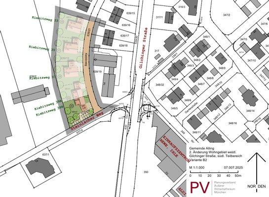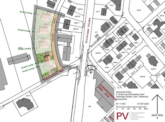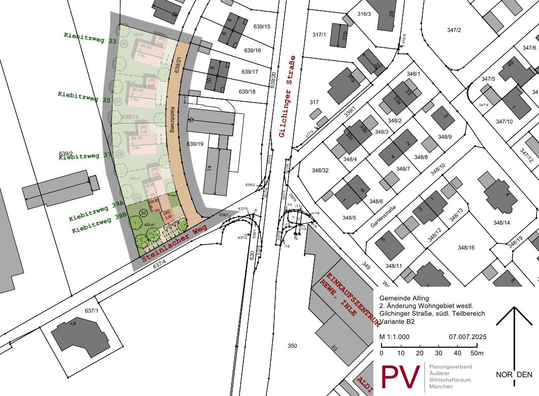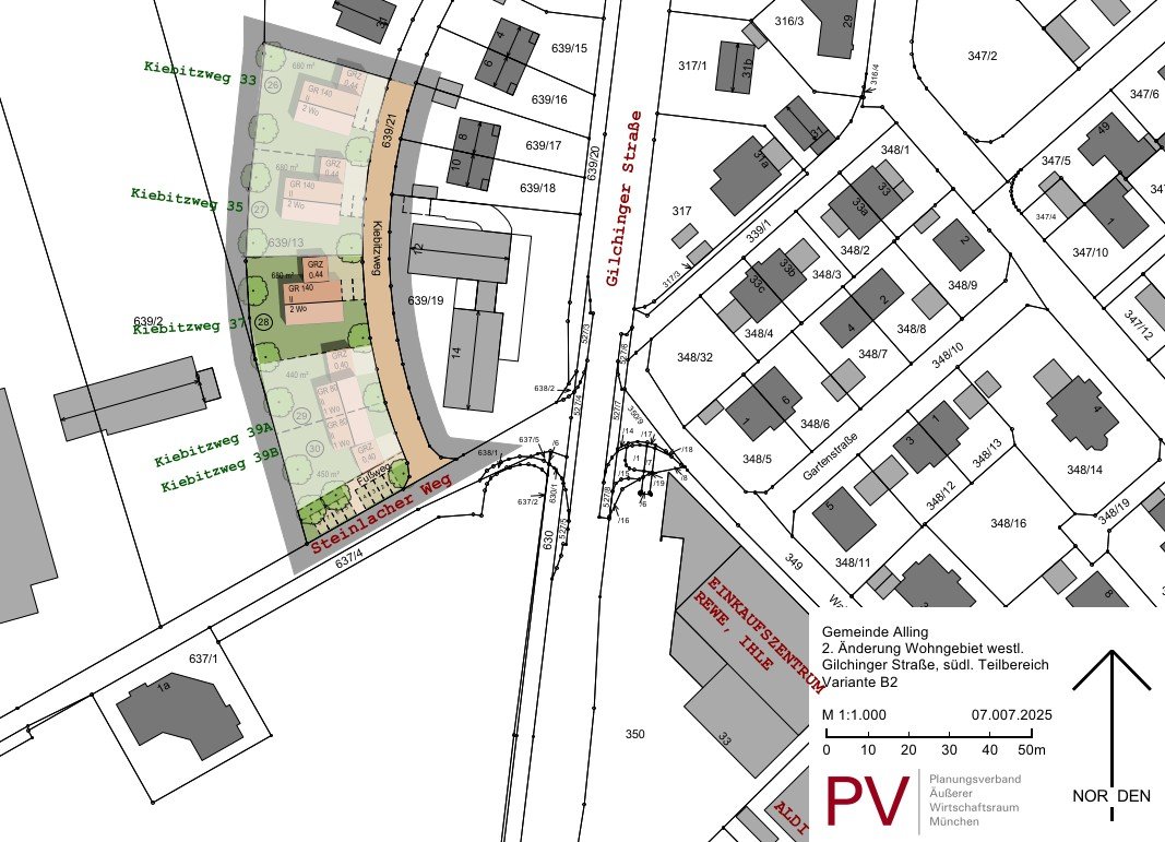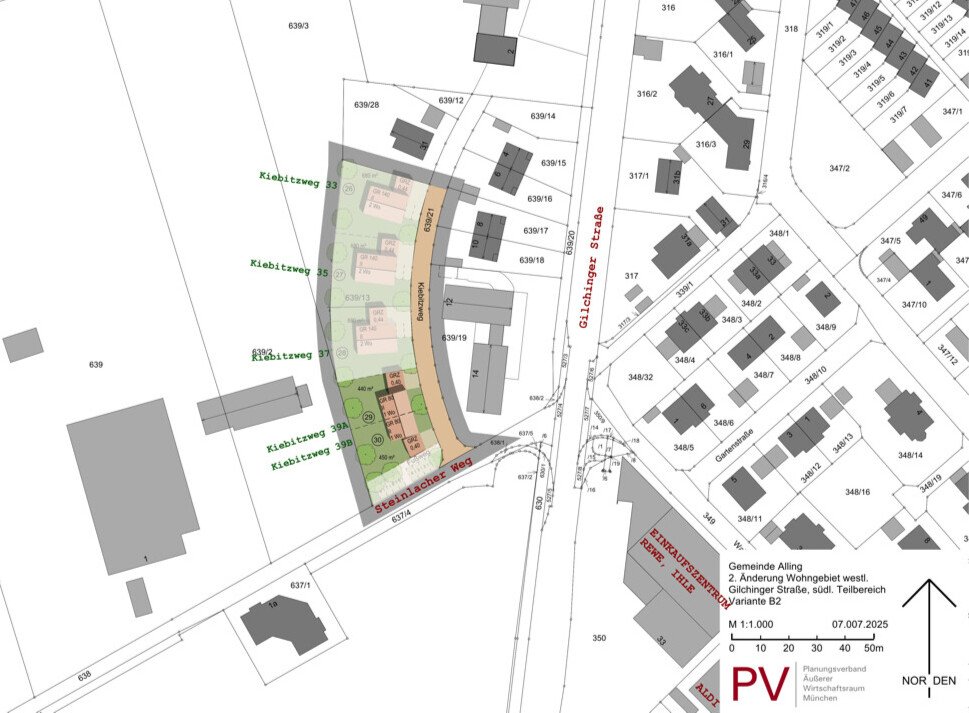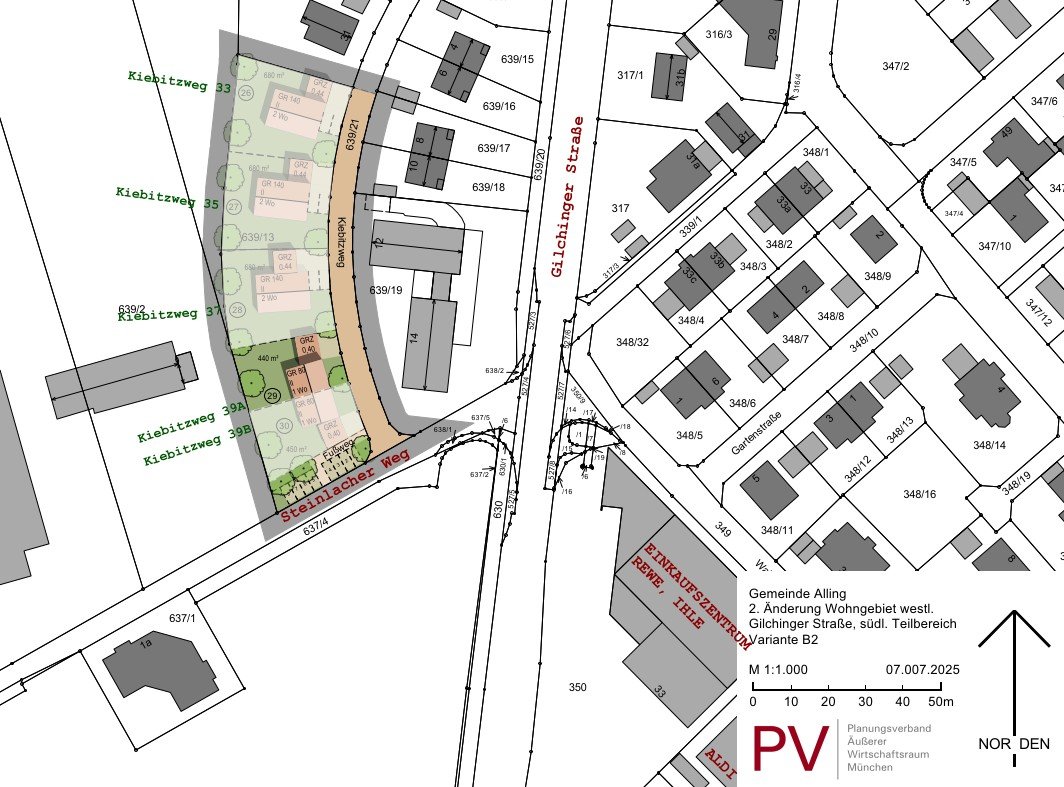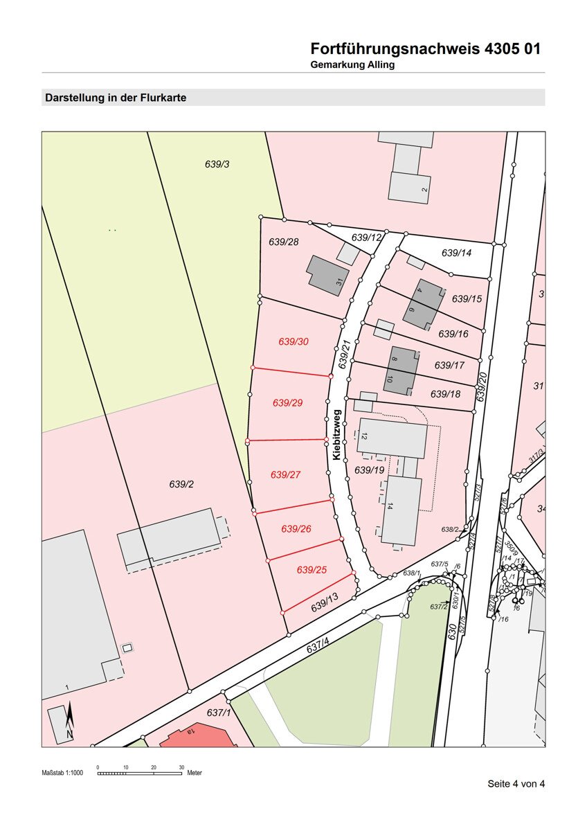 Bei den hier angebotenen Bauparzellen (im Plan beschriftet mit Nr. 26 bis 30) handelt es sich um Einzelhaus-Grundstücke (26, 27, 28) bzw. um Grundstücke für jeweils eine Doppelhaushälfte (29, 30) am südlichen "Kiebitzweg" in Alling.