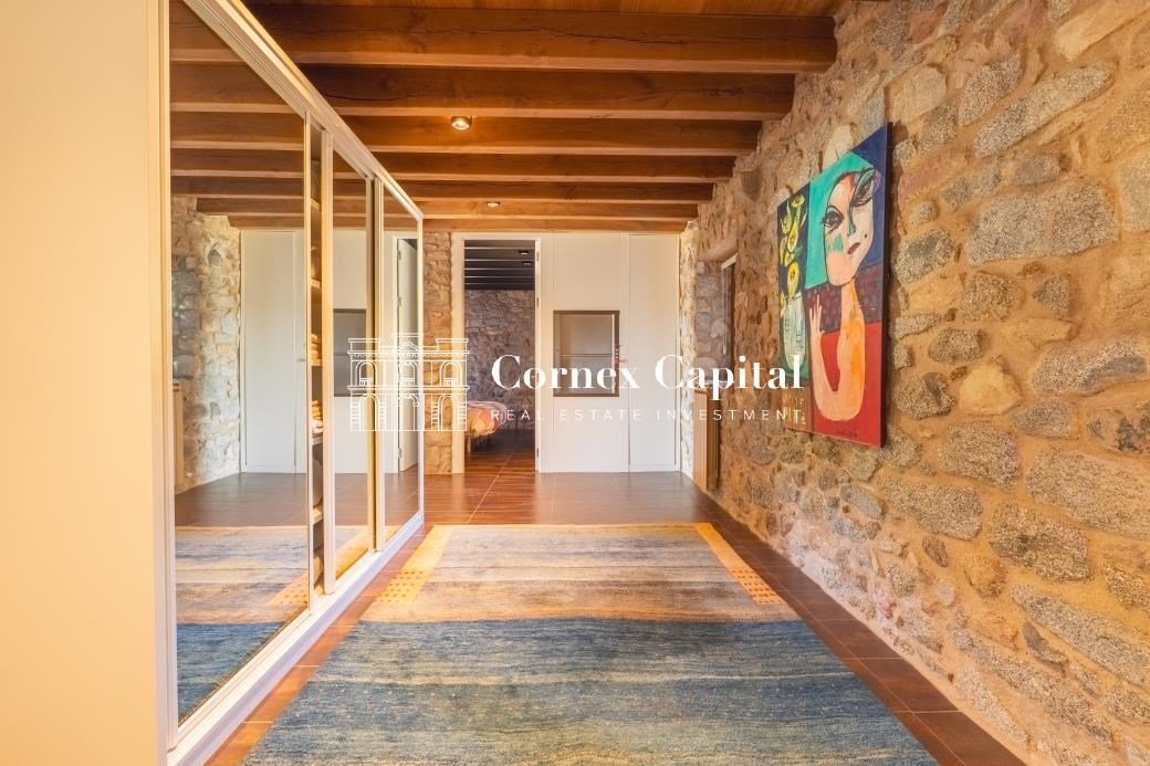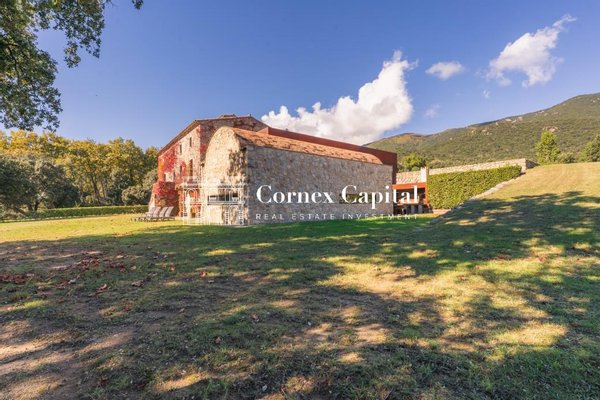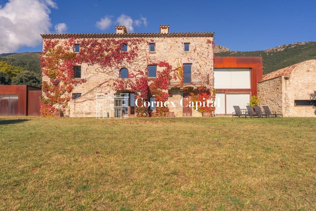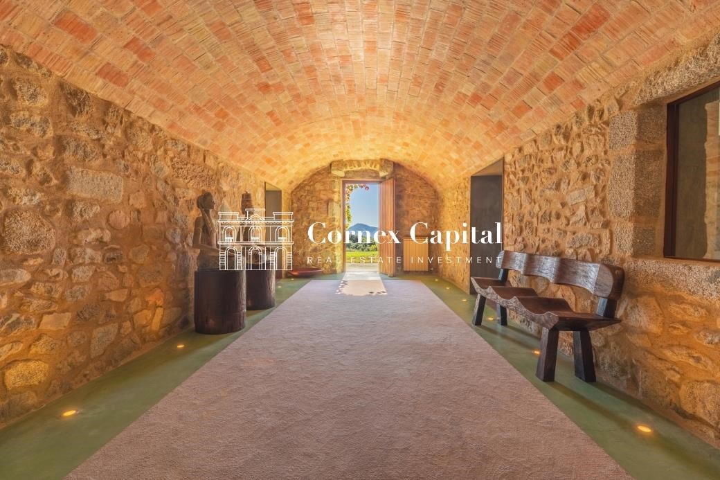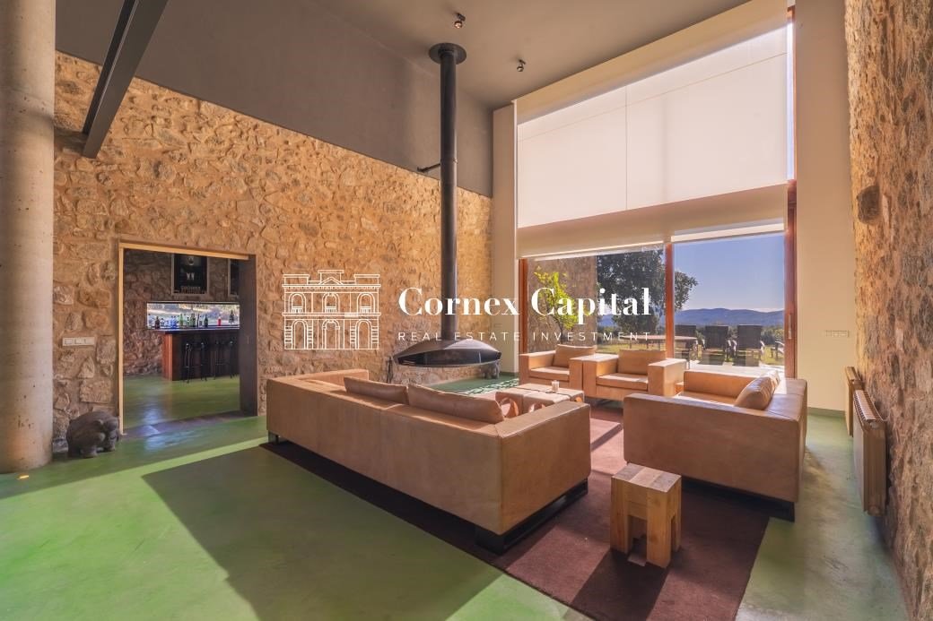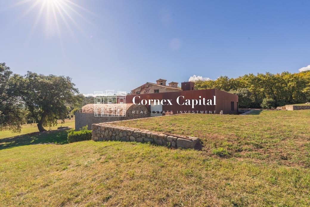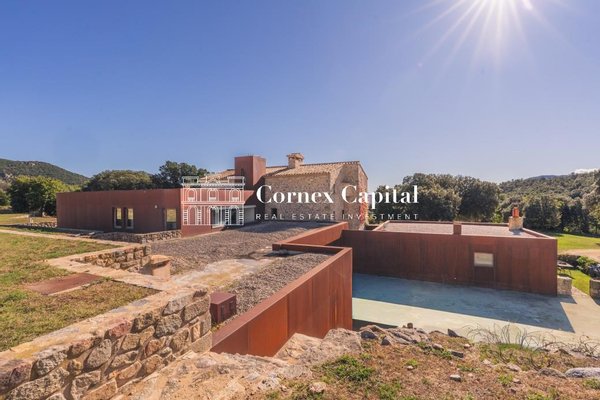 Entdecken Sie dieses atemberaubende, sorgfältig renovierte Luxuslandhaus, eine Mischung aus traditioneller katalanischer Architektur und anspruchsvollem modernem Design. Das Grundstück umfasst das Haupthaus und ein separates Hausmeisterhaus, beide nach Süden ausgerichtet, mit 1.270 m² Wohnfläche auf 150 Hektar Privatland, umgeben von Korkeichen und üppiger Vegetation.