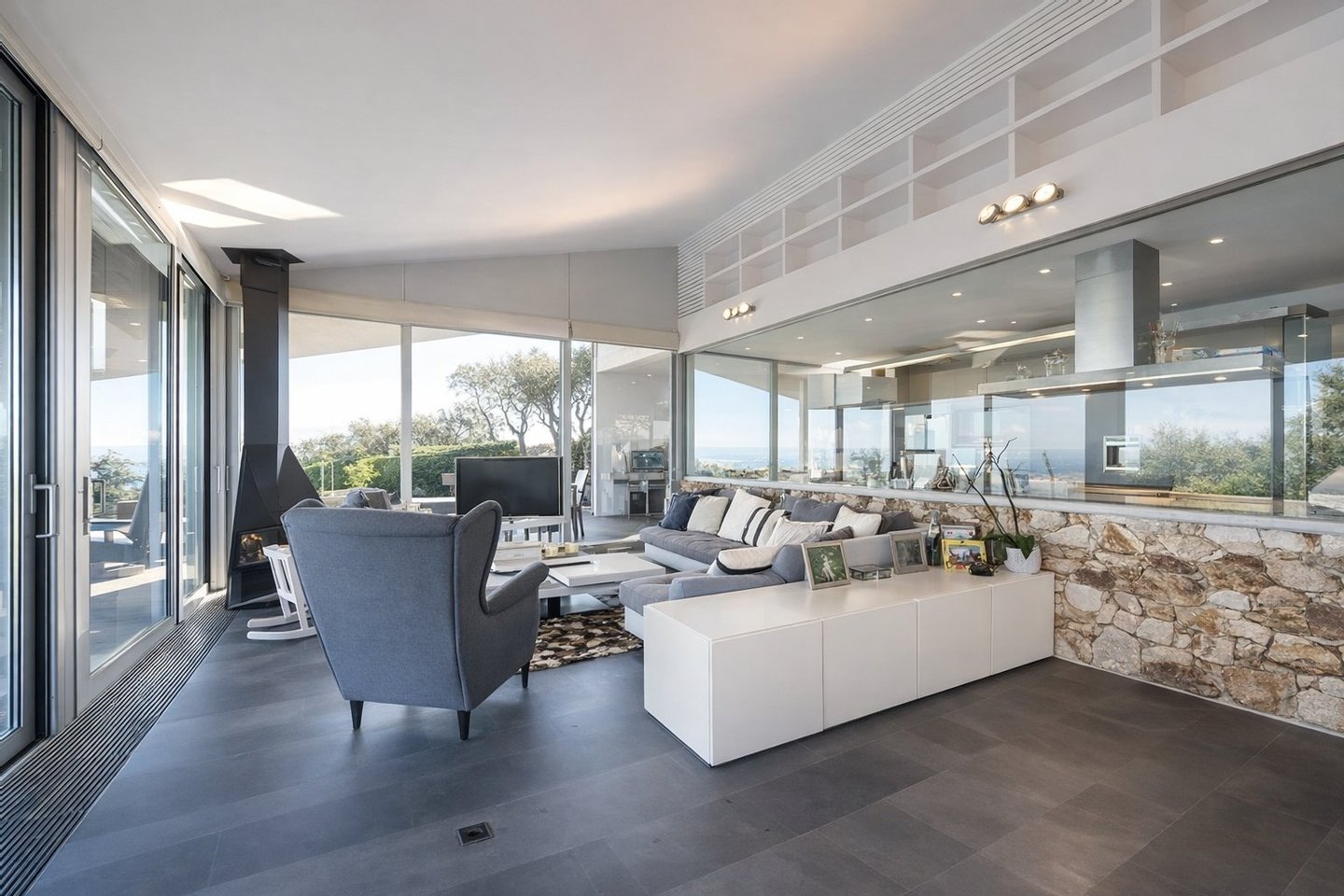 Das Interieur zeichnet sich durch seinen zeitgenössischen Stil aus, mit besonderem Augenmerk für Licht und Raum. Die Materialien – Glas, Holz und Stein – sind harmonisch miteinander verbunden, während offene Bilder und klare Perspektiven Leichtigkeit und Kontinuität zwischen den Räumen bringen.Das Wohnzimmer und Esszimmer, im offenen Raumkonzept konzipiert, öffnen sich durch große Panoramafenster zu den Terrassen und zum Meer und verbinden Innen und Außen auf natürliche Weise.