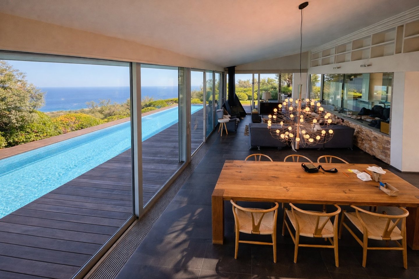Das Wohnzimmer und Esszimmer, im offenen Raumkonzept konzipiert, öffnen sich durch große Panoramafenster zu den Terrassen und zum Meer und verbinden Innen und Außen auf natürliche Weise.