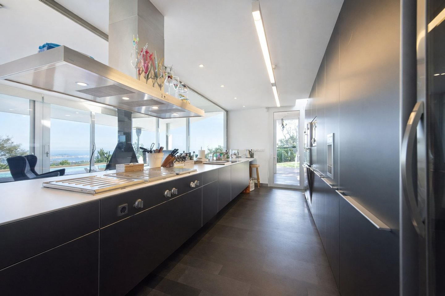 Das Küchen-Esszimmer, mit einem exklusiven Bulthaup-Design und ausgestattet mit Gaggenau-Geräten, vereint Ästhetik und hohe Qualität. Eine Glastrennwand verstärkt das Gefühl von visueller Leichtigkeit, während der Speisesaal natürliches Licht und einen panoramischen Meeresblick bietet, der direkt vom Tisch aus sichtbar ist.