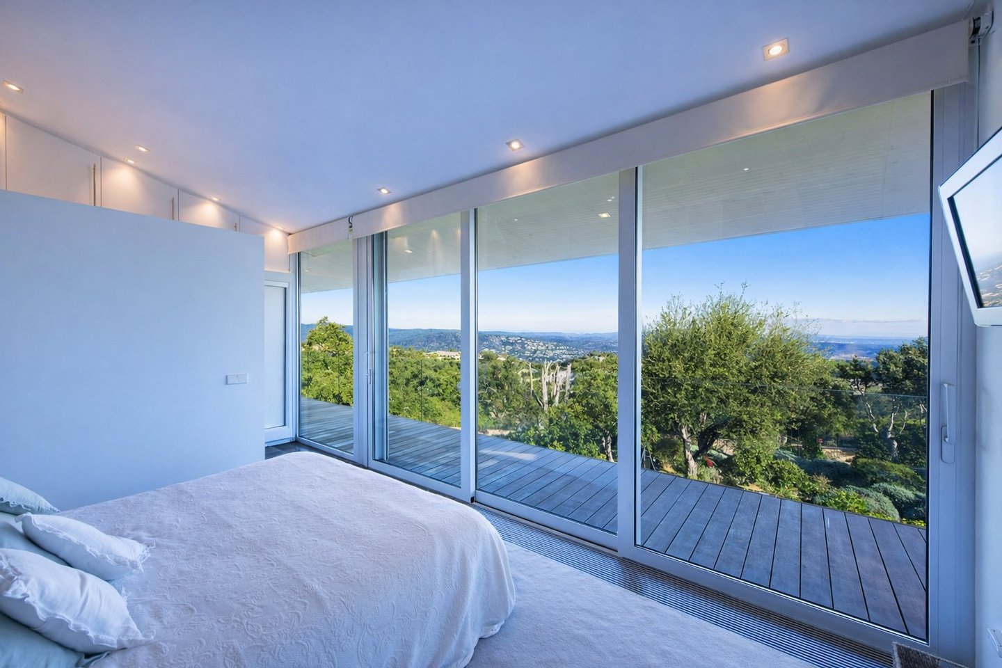 Das Interieur zeichnet sich durch seinen zeitgenössischen Stil aus, mit besonderem Augenmerk für Licht und Raum. Die Materialien – Glas, Holz und Stein – sind harmonisch miteinander verbunden, während offene Bilder und klare Perspektiven Leichtigkeit und Kontinuität zwischen den Räumen bringen.Das Wohnzimmer und Esszimmer, im offenen Raumkonzept konzipiert, öffnen sich durch große Panoramafenster zu den Terrassen und zum Meer und verbinden Innen und Außen auf natürliche Weise.