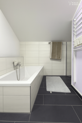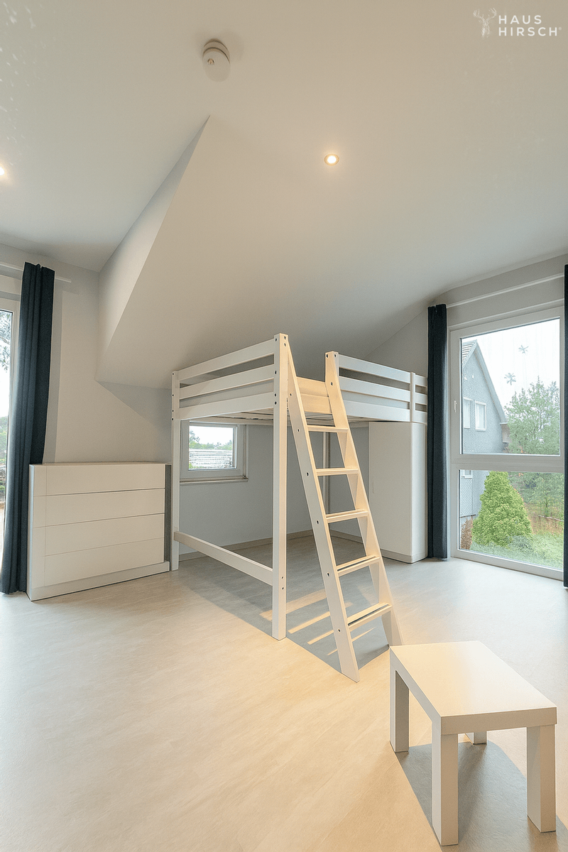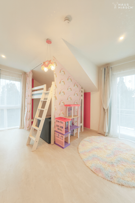 Im Dachgeschoss erwarten Sie drei weitere Wohnräume: ein großzügiges Schlafzimmer sowie zwei Kinderzimmer. Beide Kinderzimmer verfügen über einen eigenen Zugang zum Balkon mit Blick in den Garten – ein schöner Rückzugsort mit viel Tageslicht und Frischluft. Zusätzlich befindet sich hier ein vollwertiges Badezimmer mit Badewanne und einer modernen, begehbaren Dusche.