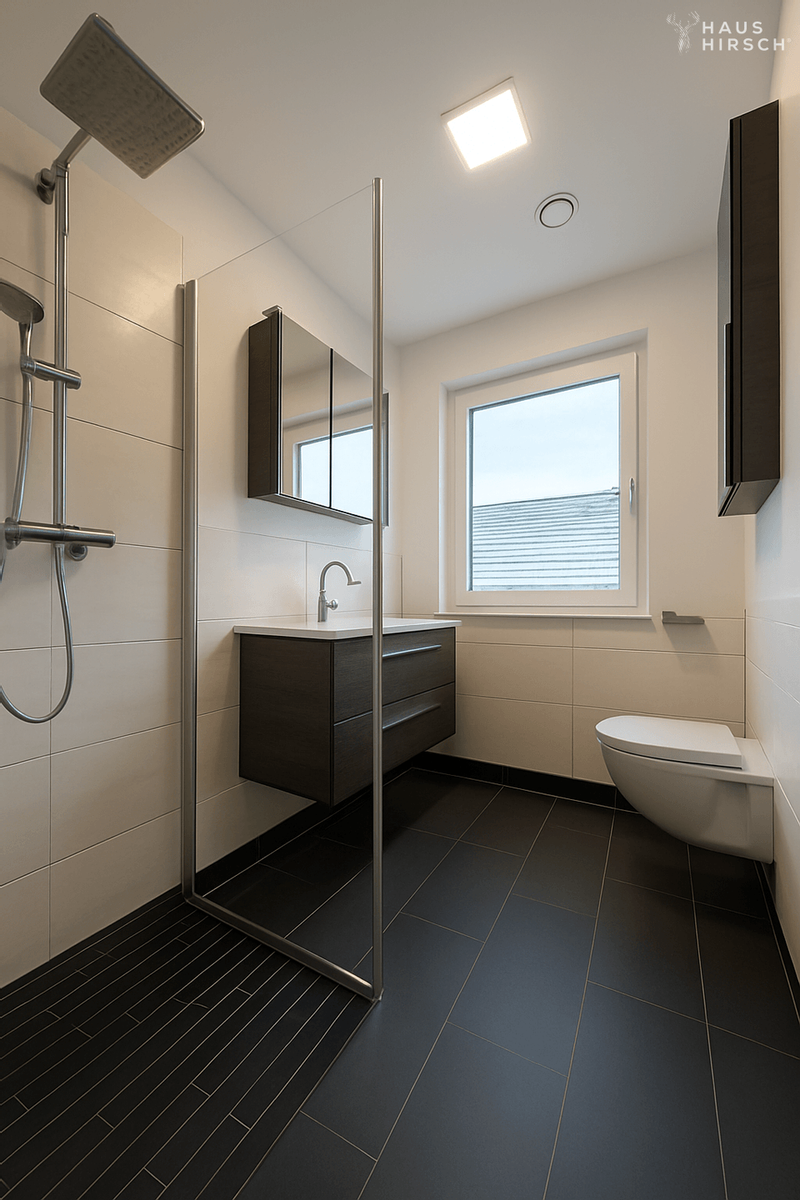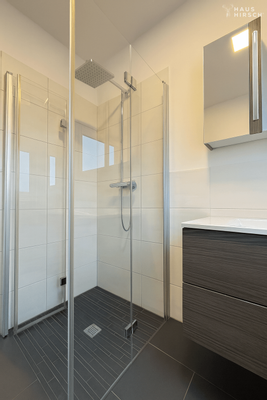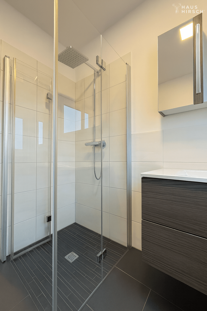 Beim Betreten des Hauses empfängt Sie ein einladender Flurbereich, der sofort ein Gefühl von Großzügigkeit vermittelt. Gleich rechter Hand befindet sich eine praktische und geräumige Garderobe, die ausreichend Platz für Jacken, Schuhe und Alltagsutensilien bietet. Direkt daneben liegt ein modernes Duschbad – ideal für Gäste oder den schnellen Frischekick am Morgen.