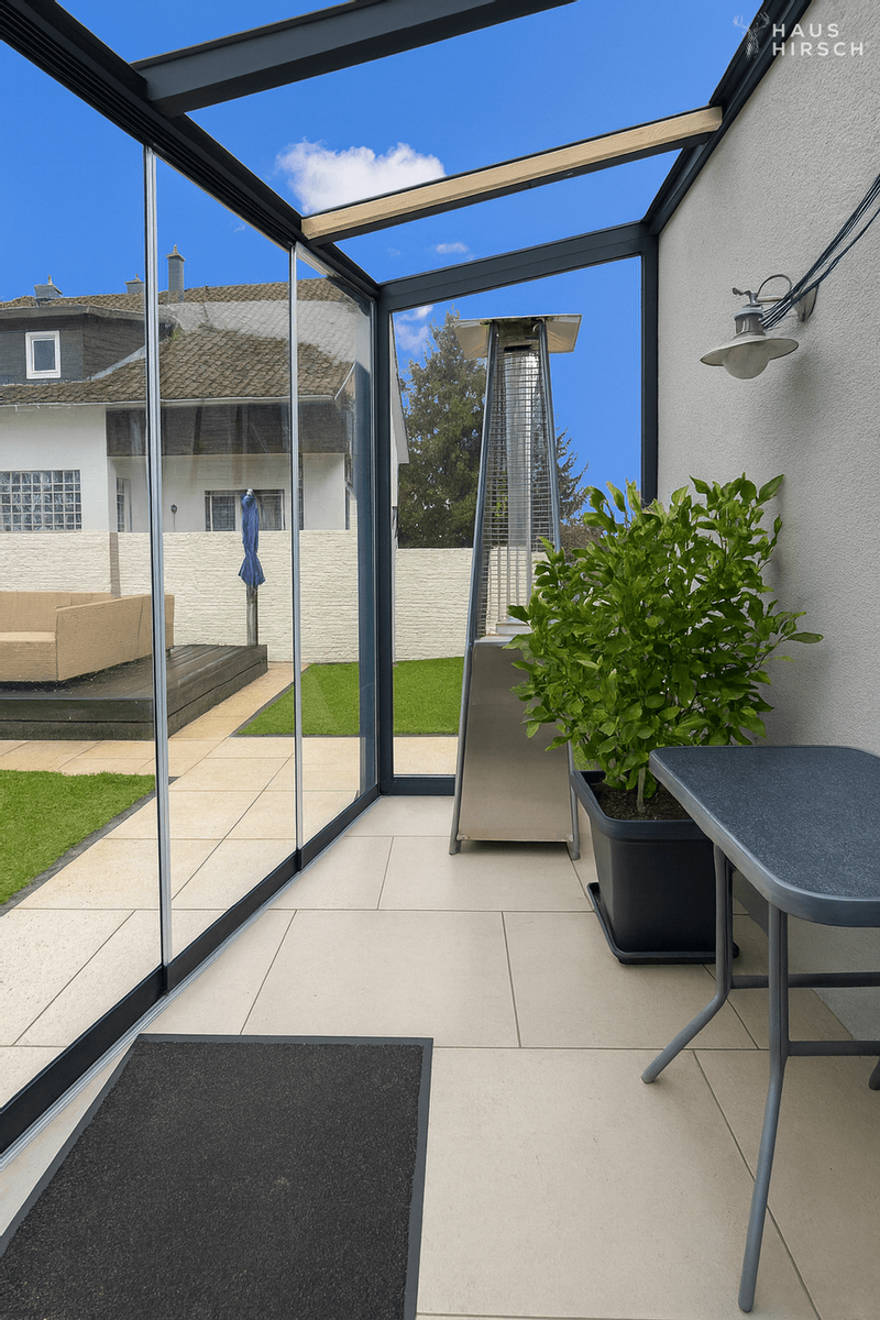 Vom Essbereich aus gelangen Sie direkt in den stilvollen Wintergarten, der durch Glaselemente viel Transparenz bietet und einen fließenden Übergang zu den Außenanlagen schafft. Der Boden ist hier wie auch im angrenzenden Terrassenbereich mit hochwertigen Natursteinplatten gestaltet – ein elegantes Detail, das die hochwertige Gestaltung auch im Außenbereich fortführt.