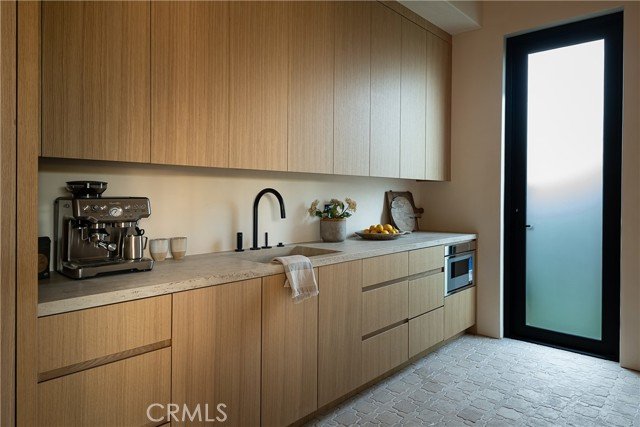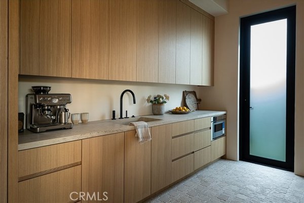 5824 Manton Avenue, das als Triumph des architektonischen Einfallsreichtums enthüllt wurde, ist ein Leuchtturm für organisches, modernes Design in der begehrten Enklave Walnut Acres in Woodland Hills, ein Meisterwerk, das bereit ist, Architectural Digest zu zieren. Dieses geschlossene Anwesen erstreckt sich über 7.470 Quadratmeter auf einer einzigen Ebene und verfügt über fünf Schlafzimmer, sechs Spa-inspirierte Badezimmer und ein eigenes Büro, alles auf einem 22.580 Quadratmeter großen Grundstück. Dieses geschlossene Refugium wurde für Visionäre entworfen und definiert luxuriöses Wohnen mit Innovation und Eleganz neu. Im Inneren verschmelzen Wellness und Luxus in einem Layout, das auf Gelassenheit ausgelegt ist. Die venezianischen Marmarino-Gipswände schimmern in Tiefe, während Lamellen-Gipsakzente die geschwungenen Kamine und eine Bar veredeln und für Raffinesse sorgen. Organische Materialien, natürliche Texturen und Holzbalkendecken schaffen eine beruhigende Atmosphäre, mit 14 Fuß hohen Decken und einem gewölbten Flur, der das Ambiente aufwertet. Vom Boden bis zur Decke reichende Glasschiebetüren verwischen die Grenzen zwischen Innen- und Außenbereich, durchfluten den Raum mit Licht und rahmen üppiges Grün ein. Das Herzstück des Hauses, der Traum eines jeden Entertainers, dreht sich um eine Gourmetküche mit zwei Inseln, die mit maßgefertigten Eichenschränken, gewölbten Nischen und geriffelten Akzenten verkleidet sind und nahtlos durch Glaswände nach draußen fließen. Eine Butlerküche mit einer geräumigen Speisekammer sorgt für müheloses Gastgeben. Der Wohnbereich, der durch eine geschwungene, kannelierte Wand und einen Travertinkamin verankert ist, schafft eine filmische Kulisse. Ein hochmodernes Kino und zwei Atrien werten das Angebot des Hauses auf. Die Hauptsuite ist ein Refugium mit zwei WCs, integrierten Travertin-Waschbecken und einem Spa-inspirierten Badezimmer mit raumhohem Glas, das einen grünen Blick einrahmt. Ein großer begehbarer Kleiderschrank mit maßgefertigten Schränken aus weißer Eiche sorgt für Luxus und Organisation. In jedem Schlafzimmer spiegelt sich viel Liebe zum Detail wider. Draußen sorgt ein gepflegter Vorhof mit alten Olivenbäumen und sanfter Beleuchtung für einen Fünf-Sterne-Ton. Der Hinterhof konkurriert mit exklusiven Resorts, mit einem 65 Fuß langen Pool im Resort-Stil mit schwimmenden Wasserspielen aus Stein, zwei eleganten Cabanas und einem privaten Pickleball-Platz. Die üppige Landschaftsgestaltung schafft eine ruhige Oase unter der kalifornischen Sonne. Das Haus verfügt über energieeffiziente Sonnenkollektoren, das Control4-Smart-Home-System verwaltet Beleuchtung, Temperatur, Kameras und Musik. Das Hotel liegt in der Nähe des Trainingsgeländes der Los Angeles Rams und der Westfield Topanga Mall. Dieses Refugium bietet Abgeschiedenheit und Zugänglichkeit. 5824 Manton Avenue ist mehr als nur ein Zuhause, es ist ein Statement, ein Vermächtnis, das einen neuen Standard für luxuriöses Wohnen setzt, wo jedes Detail eine Geschichte von Innovation und Schönheit erzählt.