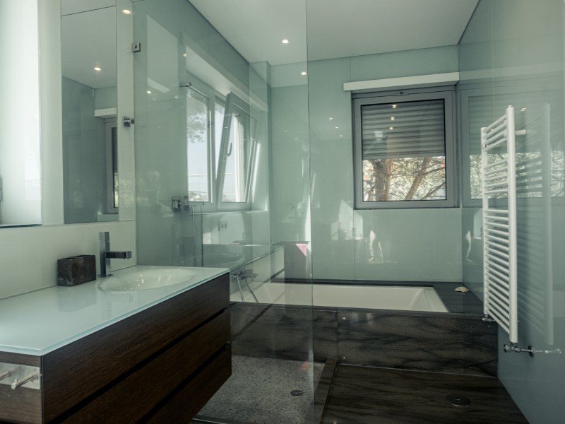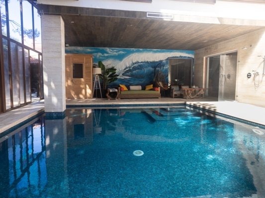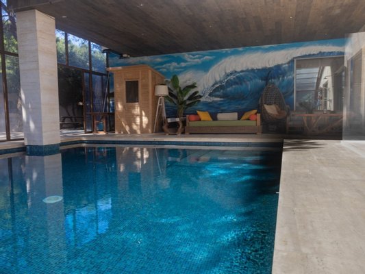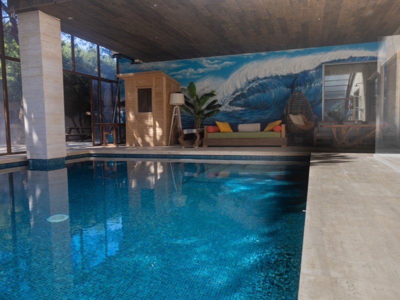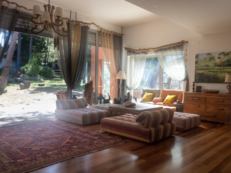 Im Erdgeschoss geht eine einladende Eingangshalle in die sozialen Bereiche des Hauses über. Die geräumige und funktionale Küche mit 24 m² ist vollständig ausgestattet und verfügt über eine Speisekammer, die hervorragende Bedingungen für den Alltag und soziale Momente bietet. Das Wohnzimmer mit beeindruckenden 72 m² profitiert von großem Tageslicht, einem Kamin mit Wärmerückgewinner und einem angenehmen Blick auf Garten und Pool, was eine angenehme und einladende Umgebung schafft. Diese Etage verfügt außerdem über ein Schlafzimmer mit eigenem Bad, ideal als Büro- oder Gästezimmer, ein Gästebad sowie direkten Zugang zum Garten, zum Hallenbad und zur Sauna.