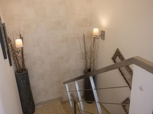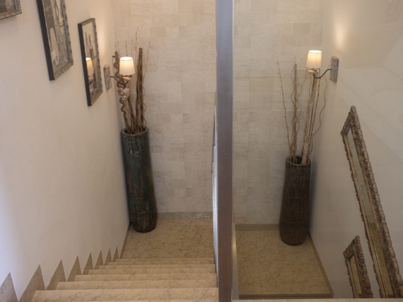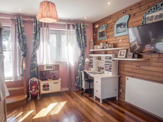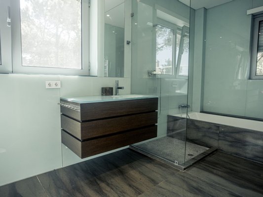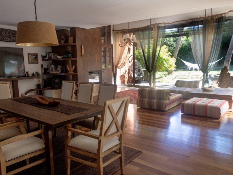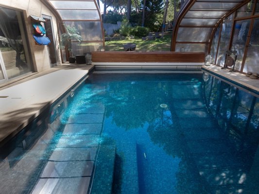 Im Erdgeschoss geht eine einladende Eingangshalle in die sozialen Bereiche des Hauses über. Die geräumige und funktionale Küche mit 24 m² ist vollständig ausgestattet und verfügt über eine Speisekammer, die hervorragende Bedingungen für den Alltag und soziale Momente bietet. Das Wohnzimmer mit beeindruckenden 72 m² profitiert von großem Tageslicht, einem Kamin mit Wärmerückgewinner und einem angenehmen Blick auf Garten und Pool, was eine angenehme und einladende Umgebung schafft. Diese Etage verfügt außerdem über ein Schlafzimmer mit eigenem Bad, ideal als Büro- oder Gästezimmer, ein Gästebad sowie direkten Zugang zum Garten, zum Hallenbad und zur Sauna.