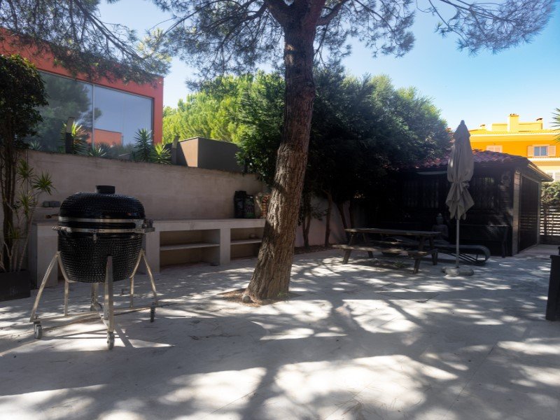 Die Außenfassade ist eines der Hauptmerkmale dieses Anwesens. Der Garten, umgeben von alten Bäumen, schafft eine einzigartige, private Waldatmosphäre, die an diesem Ort selten ist. Das Baumhaus verleiht ein markantes und charmantes Element, während der Holzanbau ideal für ein Büro, Atelier oder einen kreativen Raum ist. Der Grillbereich und die umfangreichen Outdoor-Freizeitbereiche laden dazu ein, einzigartige Momente mit Familie oder Freunden zu genießen.