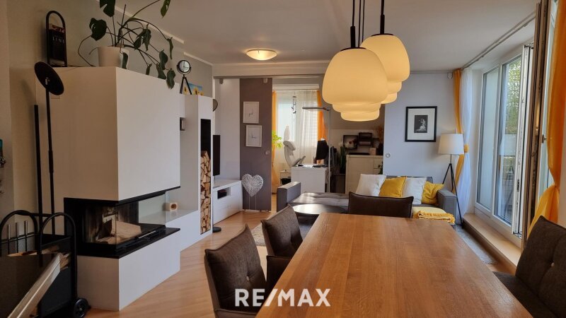 Das Herzstück der Wohnung bildet die großzügige Wohnküche, die mit ihrer modernen, stilvollen Küche sowohl funktional als auch optisch überzeugt. Der angrenzende Essbereich bietet ausreichend Platz für gemeinsame Mahlzeiten und gesellige Abende. Der lichtdurchflutete Wohnbereich lädt mit einem modernen Kamin und einer geschmackvollen Möblierung zum Verweilen ein. Ein integrierter Bürobereich macht die Wohnung auch für das Arbeiten von zu Hause aus ideal geeignet.