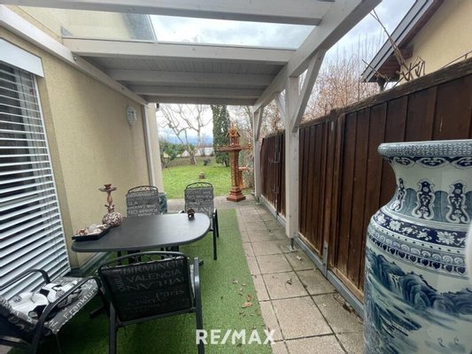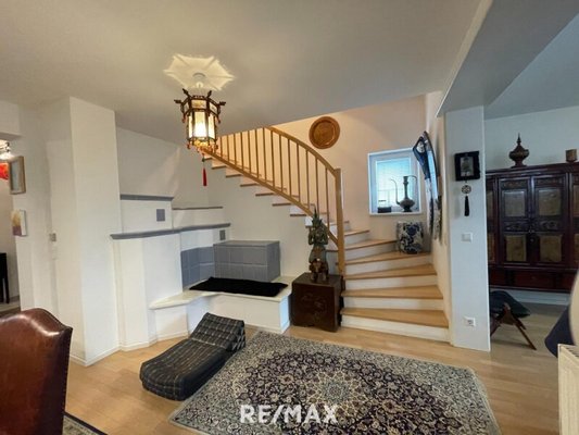 Vom Esszimmer gelangt auf die überdachte uneinsehbare Terrasse und den Garten. Ein Kamin sorgt für wohlige Wärme in der Übergangszeit.