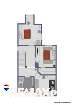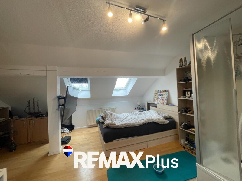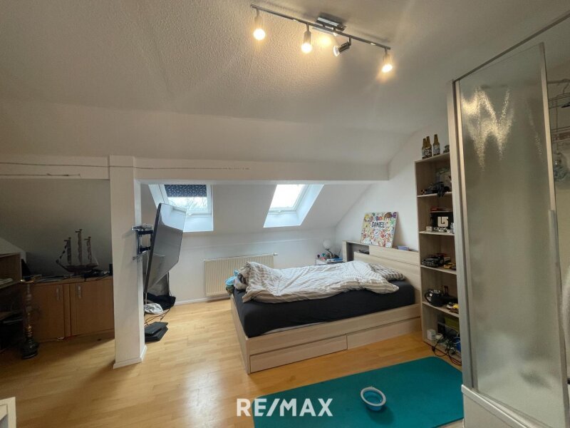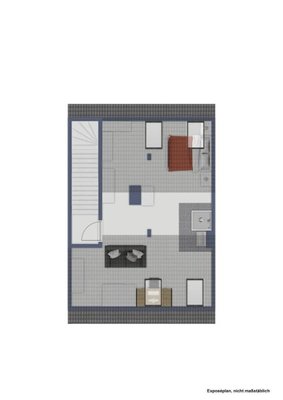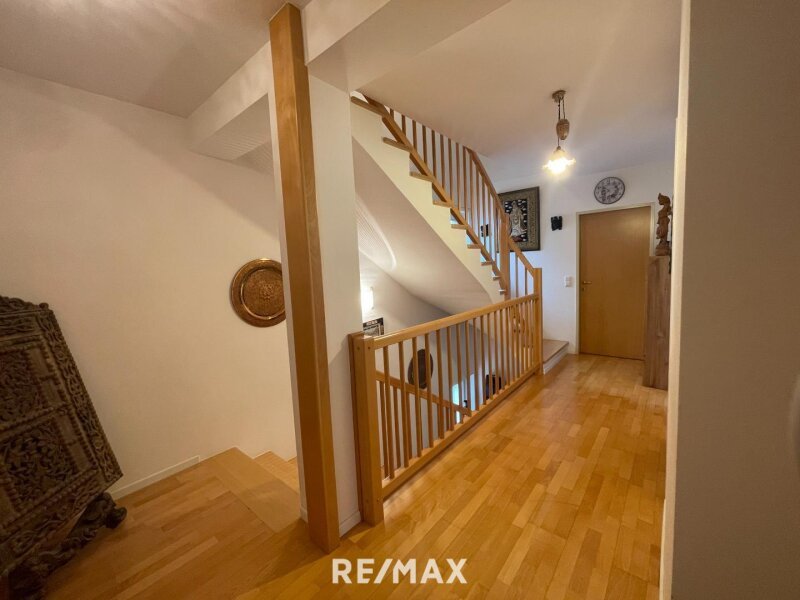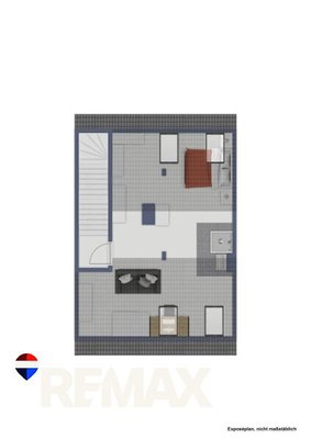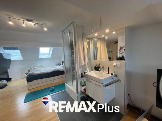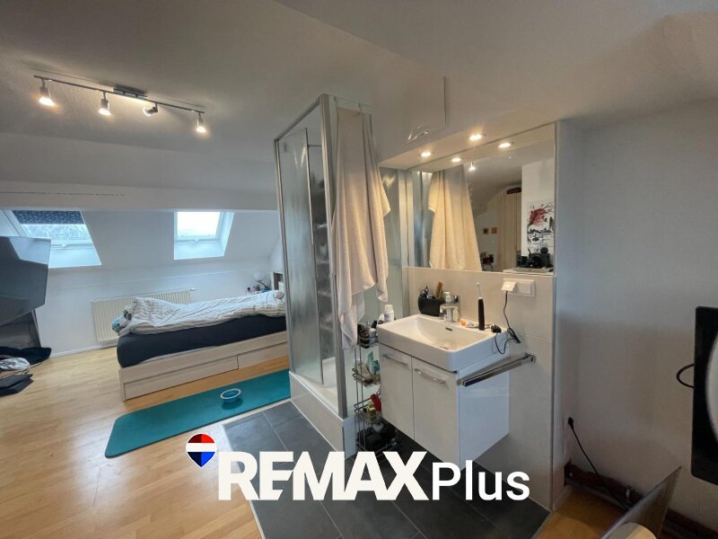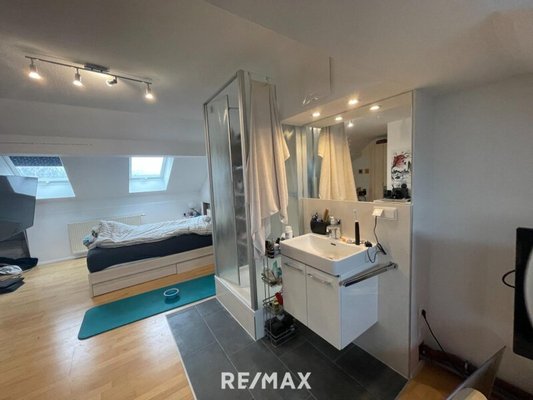 Über die Treppe erreichen Sie das einladende Loft, das mit einem kleinen Badezimmer und einem charmanten Schlafbereich überzeugt. Dieser Bereich eignet sich ideal als Rückzugsort oder Gästezimmer.