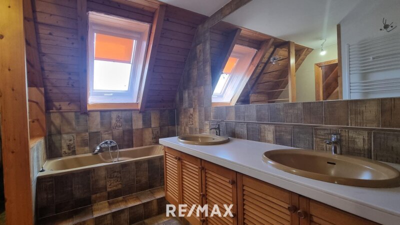 Das Obergeschoss ist sowohl über eine Treppe im Haus als auch über einen separaten Eingang erreichbar. Hier befindet sich ein weiteres Badezimmer mit Badewanne und Dusche, ein Abstellraum, ein großzügiges, helles Wohnzimmer, eine Küche, ein Kinderzimmer sowie ein Schlafzimmer. Es kann entweder als zweite Einheit genutzt werden oder ergänzt die Räumlichkeiten des Erdgeschoß mit entsprechenden zusätzlichen Räumlichkeiten.