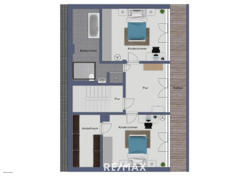 Das Dachgeschoss hält weitere drei Zimmer bereit, darunter ein besonders praktisches Zimmer mit integriertem Abstellraum. Ein Badezimmer mit Dusche ergänzt das Raumangebot dieser Etage. Auch hier lädt ein Balkon zum Verweilen ein.