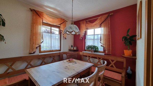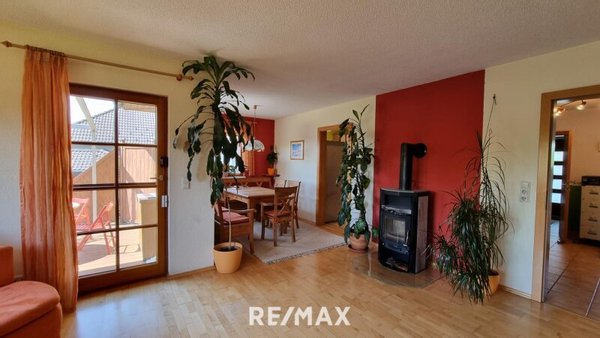 Der offen gestaltete Wohn-Essbereich mit gemütlichem Schwedenofen und großen Fensterflächen schafft eine behagliche, lichtdurchflutete Atmosphäre.