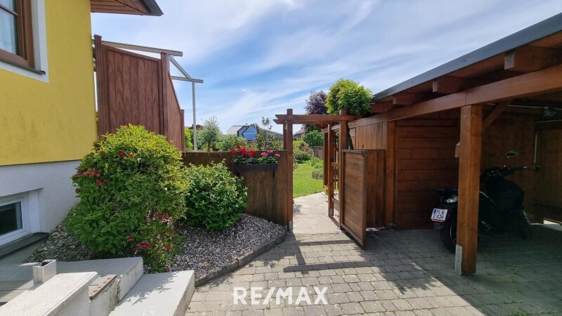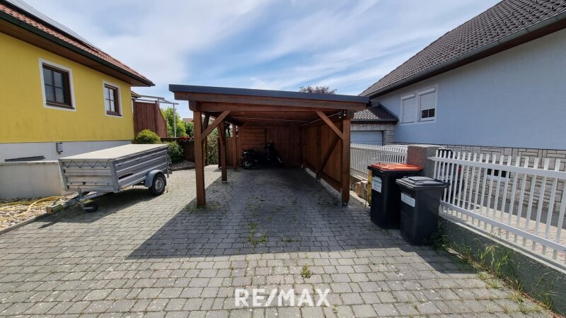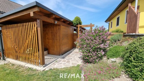 - Carport mit angeschlossenem Geräteschuppen & Holzlager