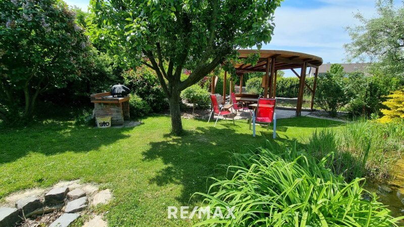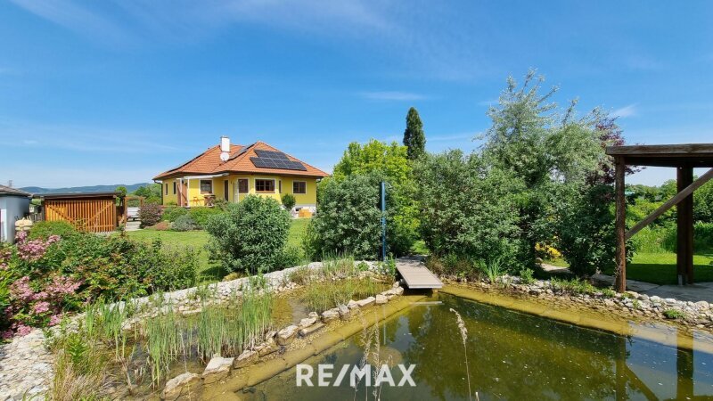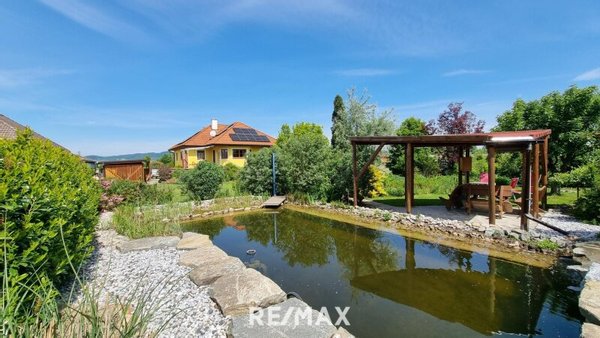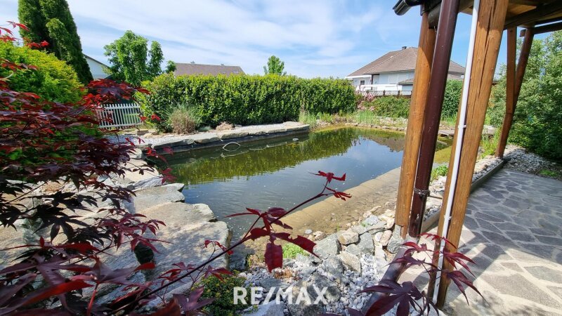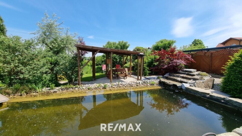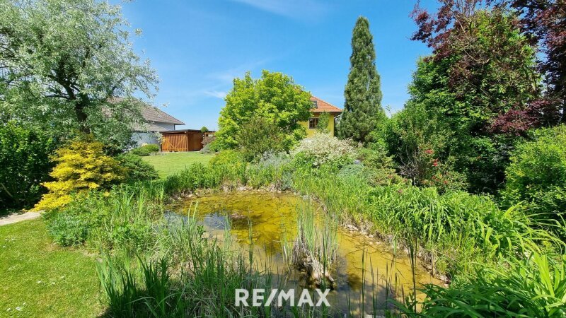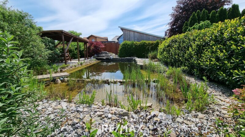 Der großzügige Garten mit Teichanlagen und die solide Bauweise machen dieses Haus zu einem besonderen Wohnjuwel.