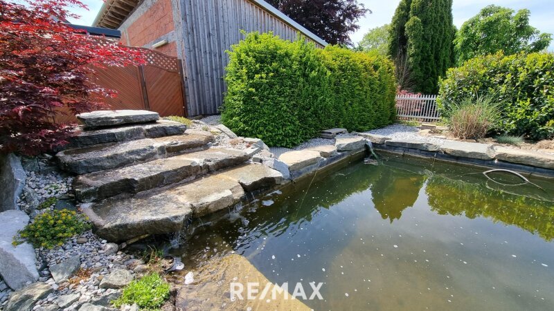 Der liebevoll gepflegte Garten bietet zwei Teichanlagen – einer davon ehemals als Koi-Teich genutzt, mit Option zur Umgestaltung als Schwimmteich. Das schöne Wasserspiel lädt unter der Lauben zum Verweilen ein. Die Technik wurde nach dem Hochwasserereignis nicht erneuert. Dennoch überzeugt das Areal durch seine Naturverbundenheit, Ruhe und vielfältige Gestaltungsmöglichkeiten.