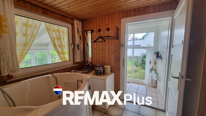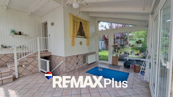 Direkt an die Küche grenzt ein kleiner Zwischenraum, von dem aus man ein weiteres WC sowie den hellen, sonnendurchfluteten Wintergarten erreicht. Die großzügige Verglasung lässt viel Tageslicht herein und schafft eine angenehme Atmosphäre. Ein integriertes Tauchbecken sorgt besonders an warmen Tagen für wohltuende Abkühlung und macht den Wintergarten zu einem Ort der Erholung und Entfaltung – zu jeder Jahreszeit.