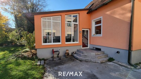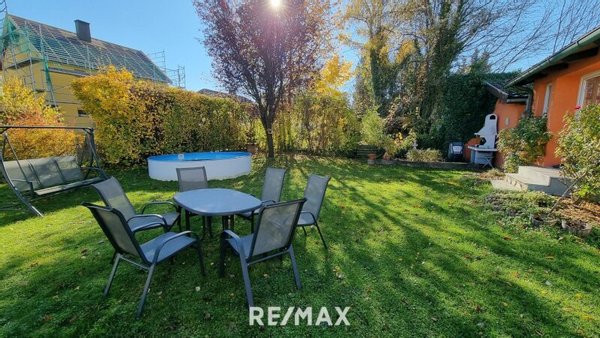 Der Wintergarten sorgt für gemütliche Stunden mit Blick in den Garten, der mit einem Pool aufwartet – ideal für warme Sommertage und geselliges Beisammensein.