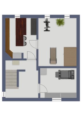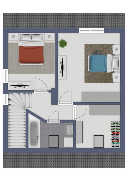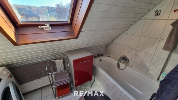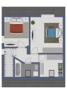 Über eine Treppe gelangen Sie ins Obergeschoss, das mit einem Schlafzimmer, einem Badezimmer mit Wanne und einem praktischen Ankleideraum überzeugt. Zusätzlich steht ein weiteres Wohnzimmer zur Verfügung, das flexibel genutzt werden kann – beispielsweise als Arbeitszimmer oder Kinderzimmer.