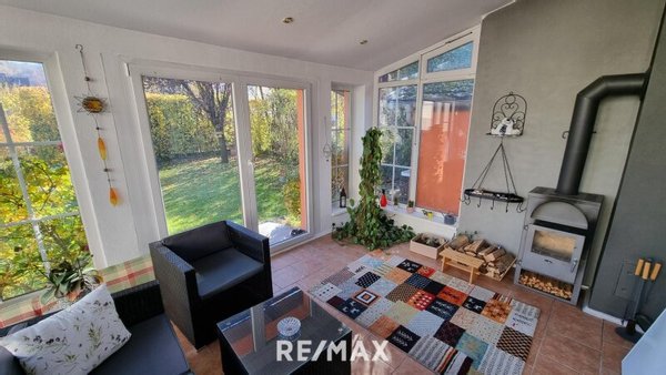 Der Wintergarten sorgt für gemütliche Stunden mit Blick in den Garten, der mit einem Pool aufwartet – ideal für warme Sommertage und geselliges Beisammensein.