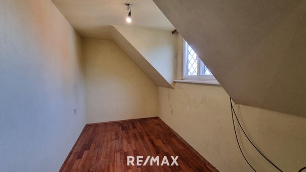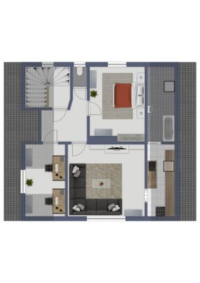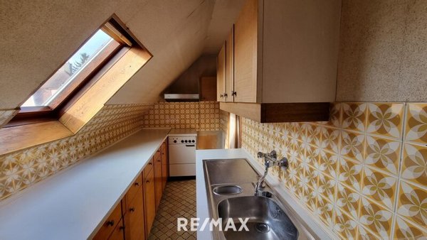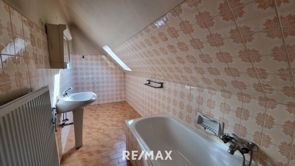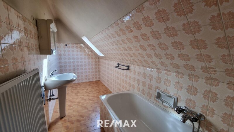 Über die Treppe im Flur gelangt man ins Obergeschoss. Dort befindet sich ein weiteres separates WC, ein ruhiges Schlafzimmer und ein Zimmer mit Dachschräge, das sich gut für verschiedene Zwecke eignet. Ergänzend bietet das Obergeschoss ein gemütliches Wohnzimmer, von dem aus man in eine langgezogene Küche mit Dachschräge gelangt. Dahinter liegt ein Badezimmer mit Badewanne und einem Dachschrägenfenster, das für natürliches Licht sorgt und den Raum angenehm wirken lässt.