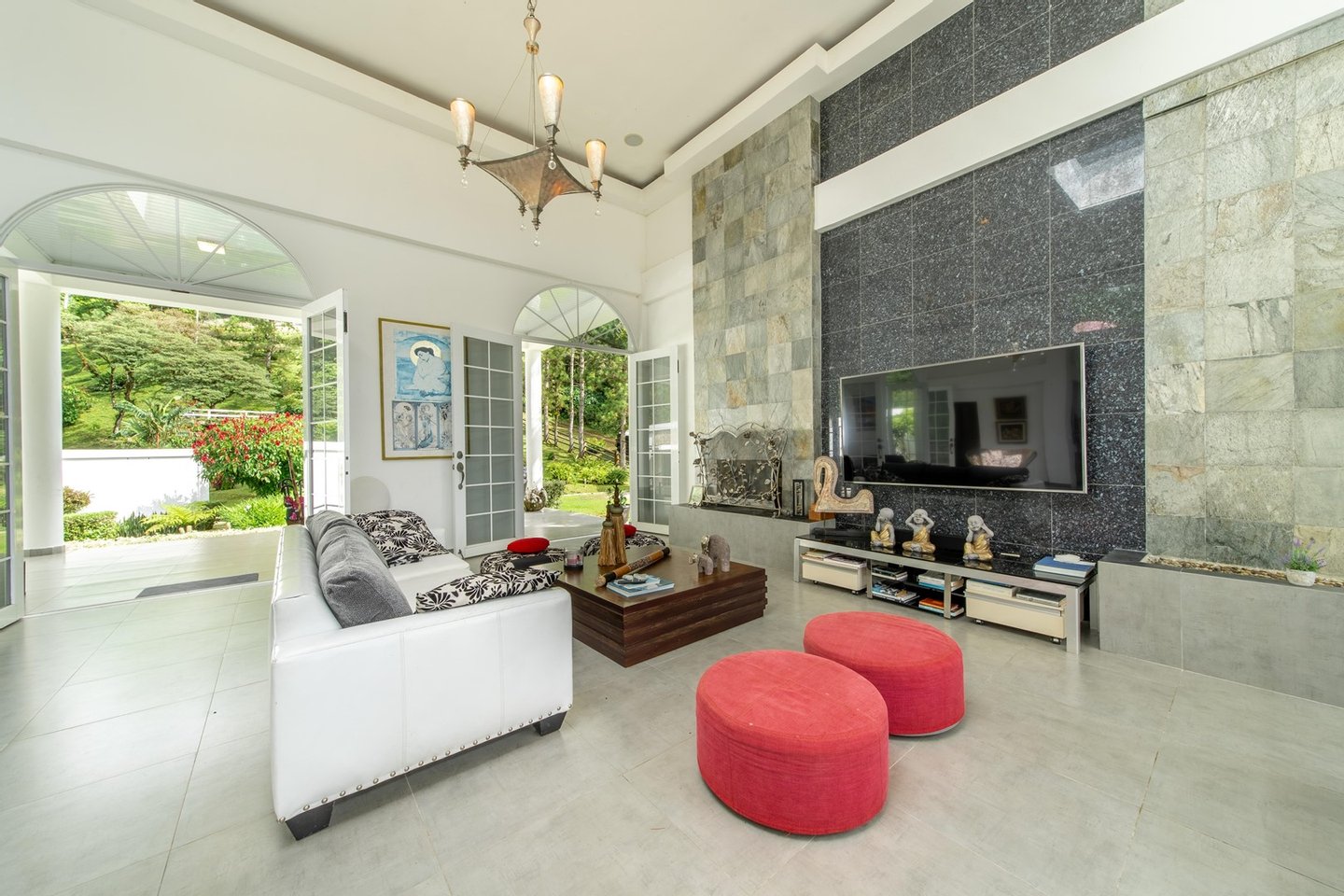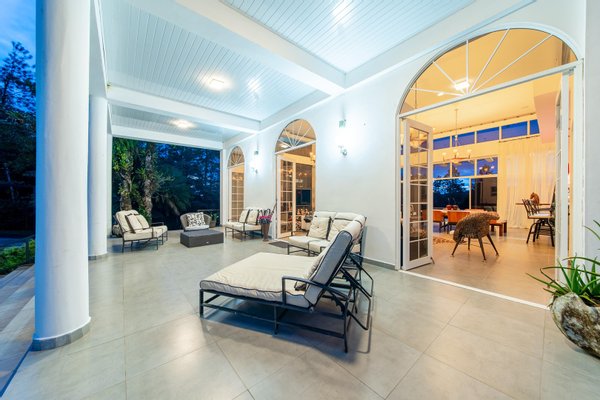 Treten Sie ein in ein Meisterwerk des Designs, in dem klassische Eleganz auf modernen Luxus trifft. Eine große Treppe führt zum Hauptwohnpavillon mit hoch aufragenden Säulen, hohen Decken und drei symmetrisch gewölbten Fenstertüren, die den Raum mit natürlichem Licht durchfluten. Im Inneren bietet der offene Raum eine geräumige Küche, eine Lounge und einen Unterhaltungsbereich, die sich alle zu überdachten Terrassen öffnen, die einen atemberaubenden Blick auf die Berge bieten.