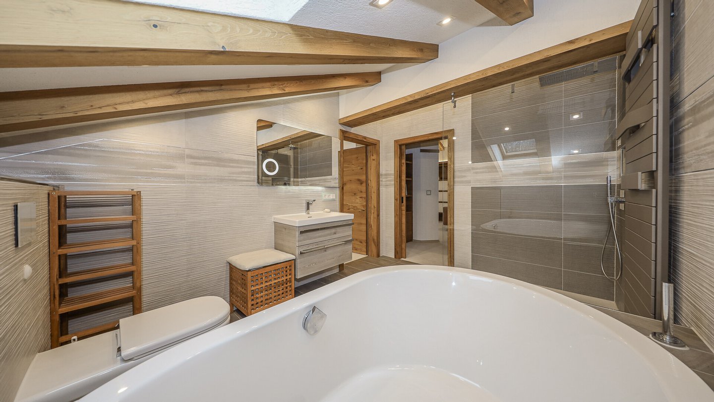 Das Obergeschoss und das Dachgeschoss beherbergen jeweils eine eigene Wohneinheit mit einem großzügigen Balkon, der Ihnen einen atemberaubenden Blick auf die umliegende Berglandschaft bietet.