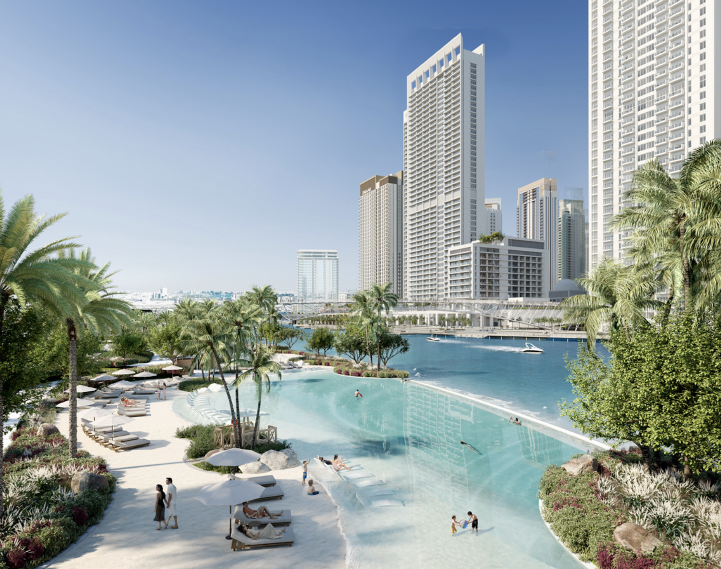 Willkommen in deinem neuen Zuhause mit Blick auf die atemberaubende künstliche Lagune! Genieße entspannende Stunden am 700 m langen Urban Beach mit weißem Sand oder schwimme im Infinity Pool und den privaten Swimmingpools. Die Sonnendecks und Lounges