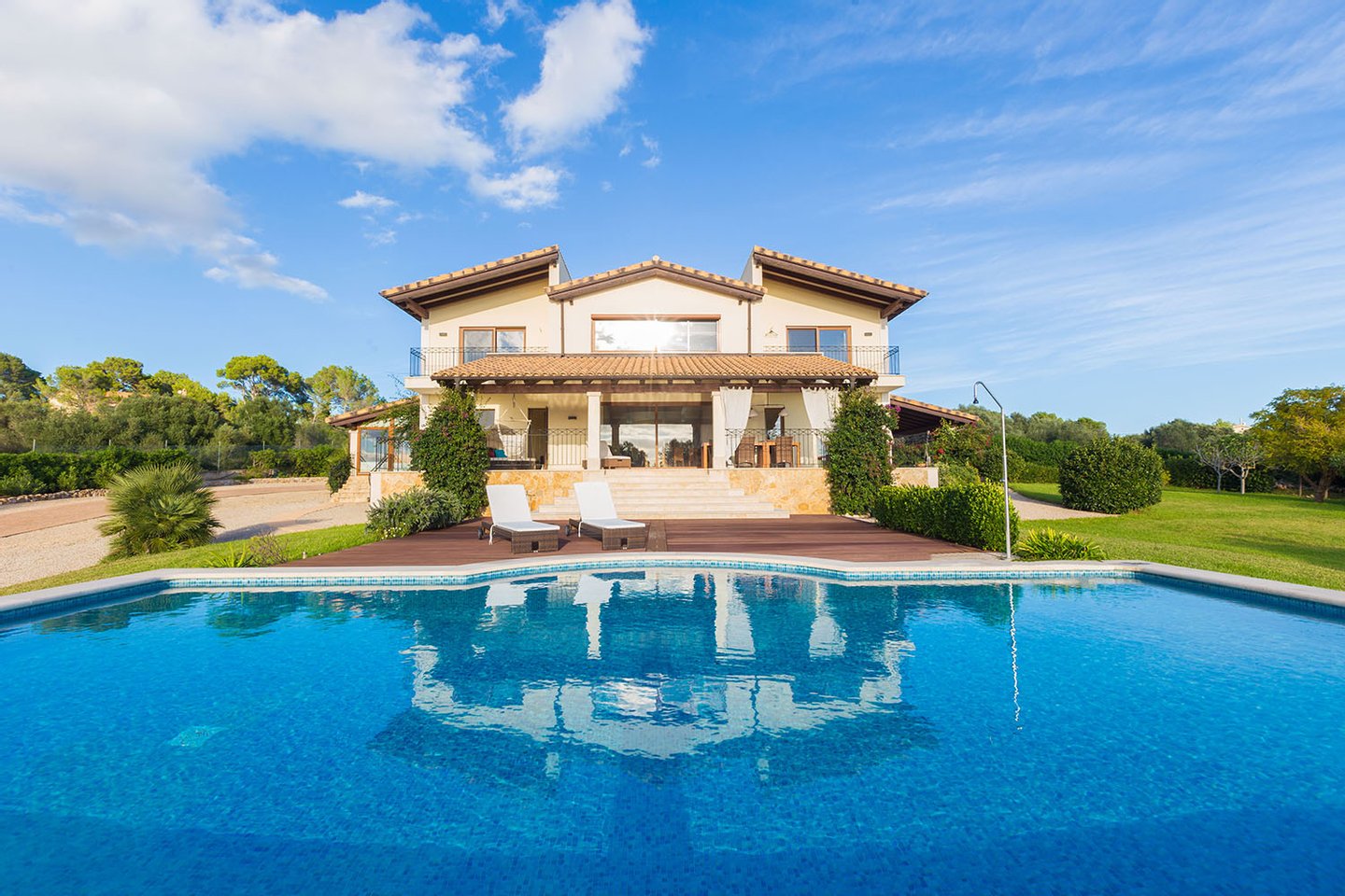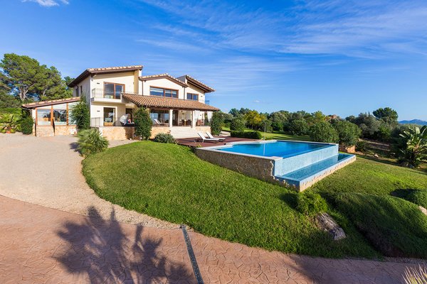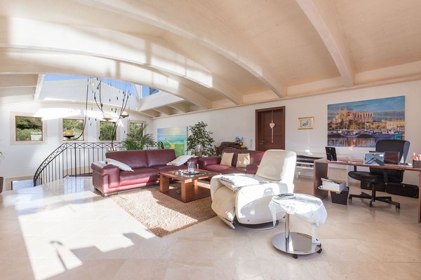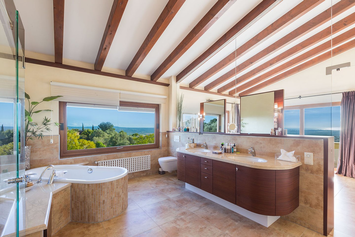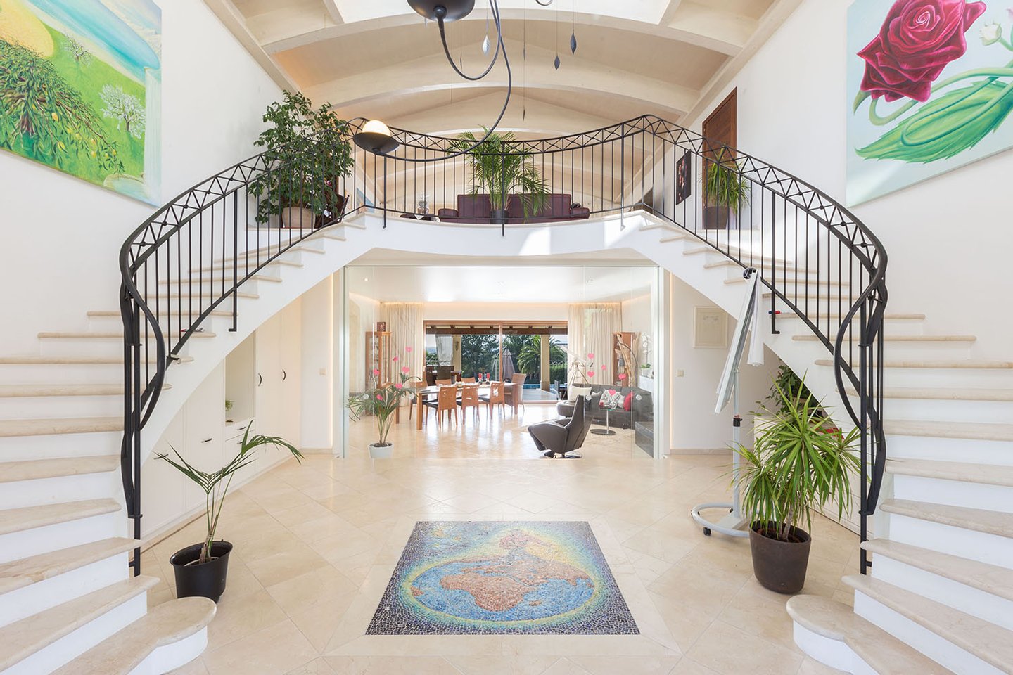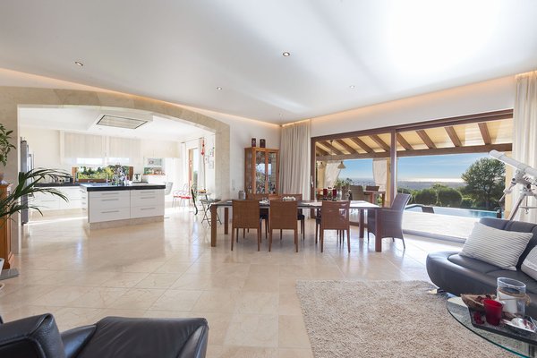 Diese großzügige, nach Südwesten ausgerichtete Villa befindet sich auf einem ländlich gelegenen Grundstück innerhalb einer Villenurbanisation und bietet einen sensationellen Meer- und Panoramaweitblick. Nur 3 km vom Golfplatz Puntiró und 15 Autominuten von Palma entfernt, genießt man hier absolute Ruhe und Exklusivität. Der Flughafen, weitere Golfplätze und Strände sind in kürzester Zeit zu erreichen. Das dreigeschossige Haus besticht mit einem warmen, stimmungsvollen Ambiente und wurde sehr ansprechend mit sorgsam ausgesuchten Details ausgestattet. Sichtbare Holzbalken, Natursteinfliesen, ein offenes und lichtdurchflutetes Wohnkonzept unterstreichen das mediterrane Flair. Die einzigartige Immobilie ist umgeben von einem idyllischen, mediterranen Garten mit einem beheizten Infinity-Pool und mehreren gemütlichen Terrassenbereichen.