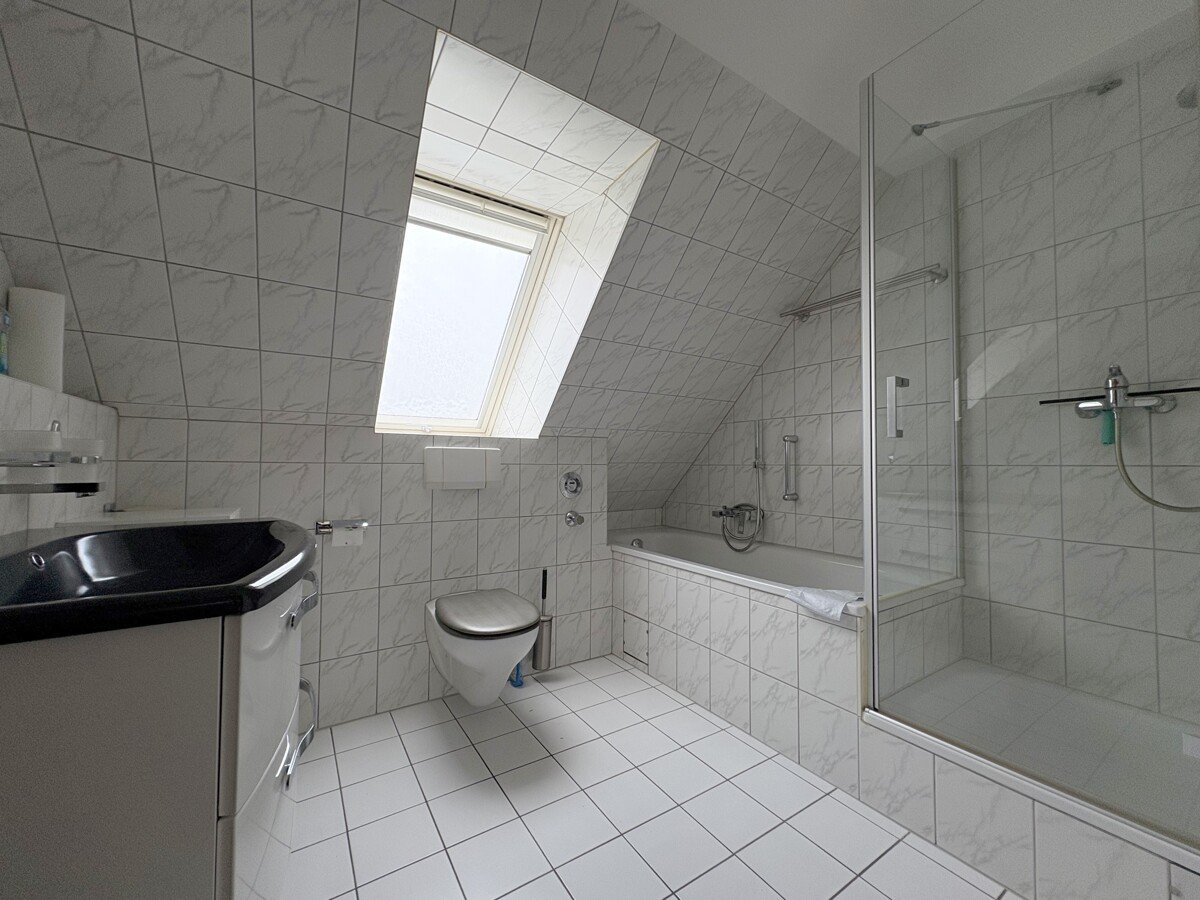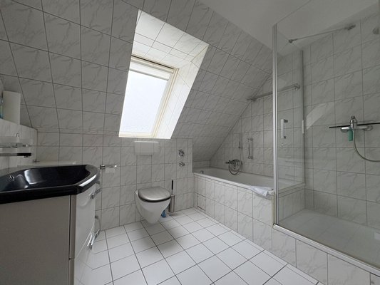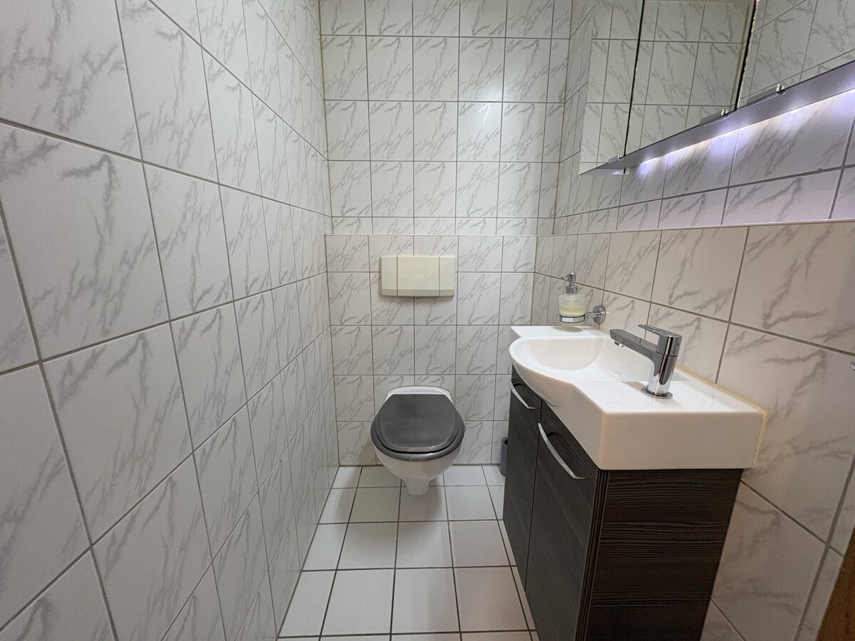 Das Tageslichtbad verfügt sowohl über eine Dusche als auch über eine Badewanne. Ein separates Gäste-WC mit Spiegelschrank ergänzt das Raumangebot komfortabel.