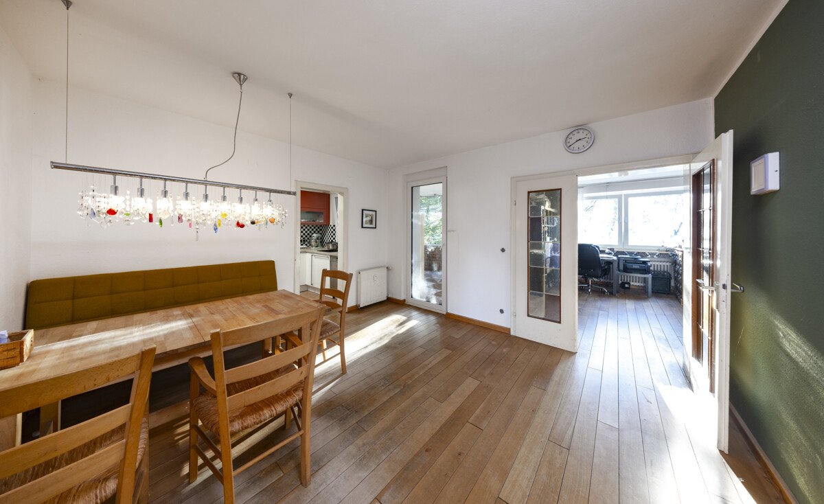Beim Betreten der Wohnung werden Sie von einer großzügigen Diele empfangen, von der aus alle Räume bequem erreichbar sind. Das geräumige Esszimmer bildet den zentralen Mittelpunkt der Wohnung. Angrenzend finden Sie das helle Wohnzimmer, die Küche mit praktischer Einbauküche sowie den Zugang zum großen, überdachten Balkon. Dieser lädt zum Entspannen ein und bietet einen angenehmen Blick ins Grüne.