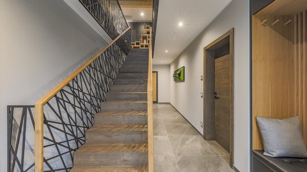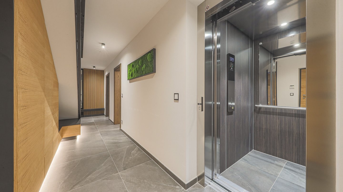 Die Chalets sind über die Tiefgarage miteinander verbunden und zu begehen, sind aber auch von außen über den Eingangsbereich zu erreichen. Jede Einheit verfügt über einen eignen Lift im Haus, welcher alle Geschosse miteinander verbindet.