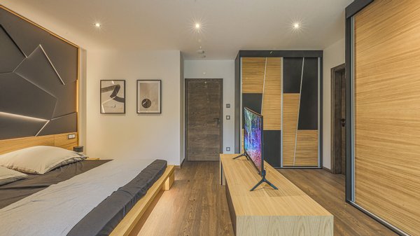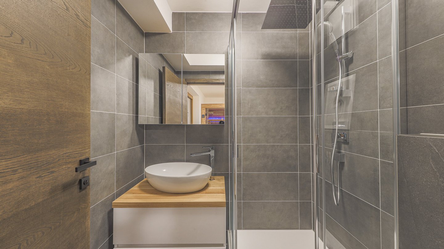 Im Untergeschoss betritt man das Chalet über die Tiefgarage, hier stehen zwei Stellplätze zur Verfügung. Der großzügige Eingangsbereich mit zahlreichen Einbauten, eine separat begehbare Garderobe und ein kleiner Wellnessbereich mit Liegefläche, Sauna und einem vollwertigen Badezimmer, bieten bereits im Untergeschoss ausreichend Platz. Der Wellnessbereich kann dank seiner Belichtung und dem Badezimmer en suite mit WC auch als Gästebereich (3. Schlafzimmer) genutzt werden.