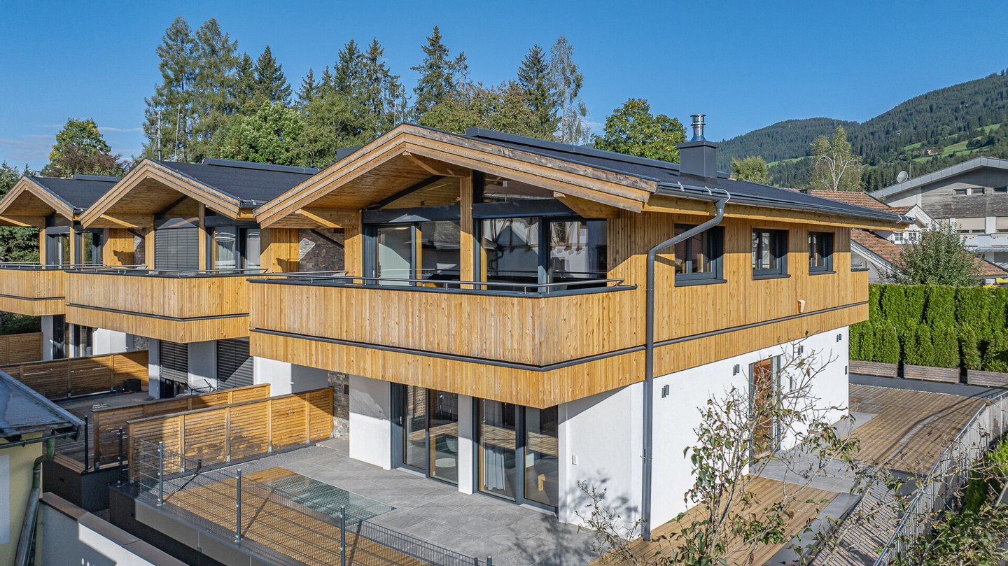 Im Zentrum von Kirchberg in Tirol in ruhiger und sonniger Lage wurden 2021 drei exklusive Chalets errichtet und bieten nicht nur einen schönen Ausblick auf die umliegende Bergwelt, sondern auch durch die moderne Bauweise und Einrichtung ein