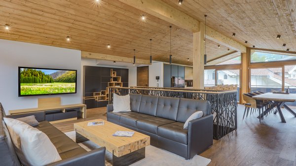 Im Dachgeschoss besteht das Chalet aus dem großzügigen Wohn-Essbereich mit offener Küche und Kochinsel, einer großen Tafel, wo bequem ca. 6-8 Personen Platz finden. Durch den mittig angeordneten Aufgang ins Dachgeschoss wurde eine perfekte Raumaufteilung geschaffen. Ein Kamin mit Sitzmöglichkeit und zahlreiche Holzarbeiten runden den Wohnbereich perfekt ab. Durch die im Dachgeschoss gebotene Raumhöhe und den damit verbundenen Sichtdachstuhl wird ein heimeliges Wohngefühl geboten. Weiters befindet sich im DG ein Gäste-WC, ein Balkon und eine Terrasse.