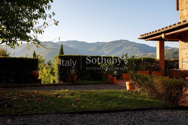 Wunderschönes Stein-Landhaus mit Swimmingpool, eingebettet in die grünen und ruhigen Hügel von Bagni di Lucca, mit panoramischem Blick auf die umliegende Landschaft und die Berge am Horizont.