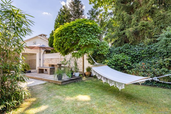 Über den liebevoll bepflanzten Vorgarten mit praktischem Fahrradhäuschen und einem stilvoll angelegten Wasserbecken mit Seerosen gelangen Sie in Ihr neues Zuhause.