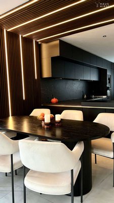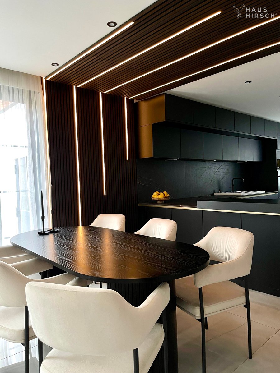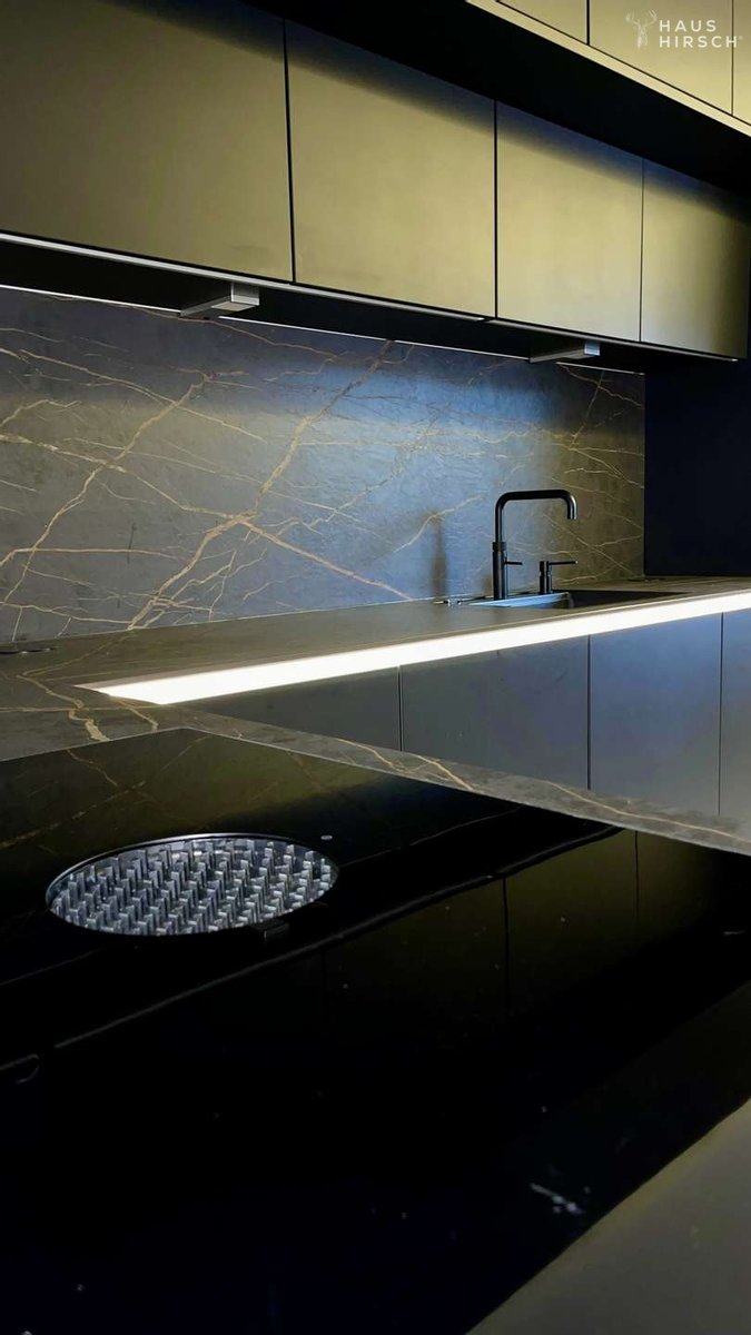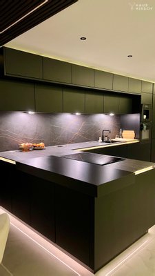 Die maßgefertigte und beleuchtete Einbau-Küche, mit modernsten Küchengeräten lädt zum kochen und verweilen ein. Die integrierte Kaffeemaschine, sowie die neuesten energieeffizienten Küchengeräte, Kühl- Gefrierkombination von Liebherr mit Wasserspender inliegend, Backofen Siemens, Bora Cerankochfeld, Quooker-Wasserspender, lassen keine Wünsche offen.