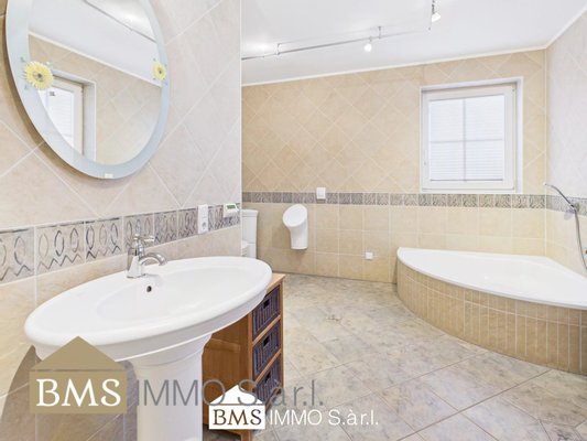 - deckenhoch gefliestes Tageslichtbad, ausgestattet mit großzügig geschnittener Eckbadewanne, Dusche, Bidet, WC, Waschtisch, Spiegel und Beleuchtung