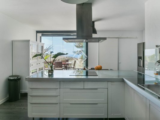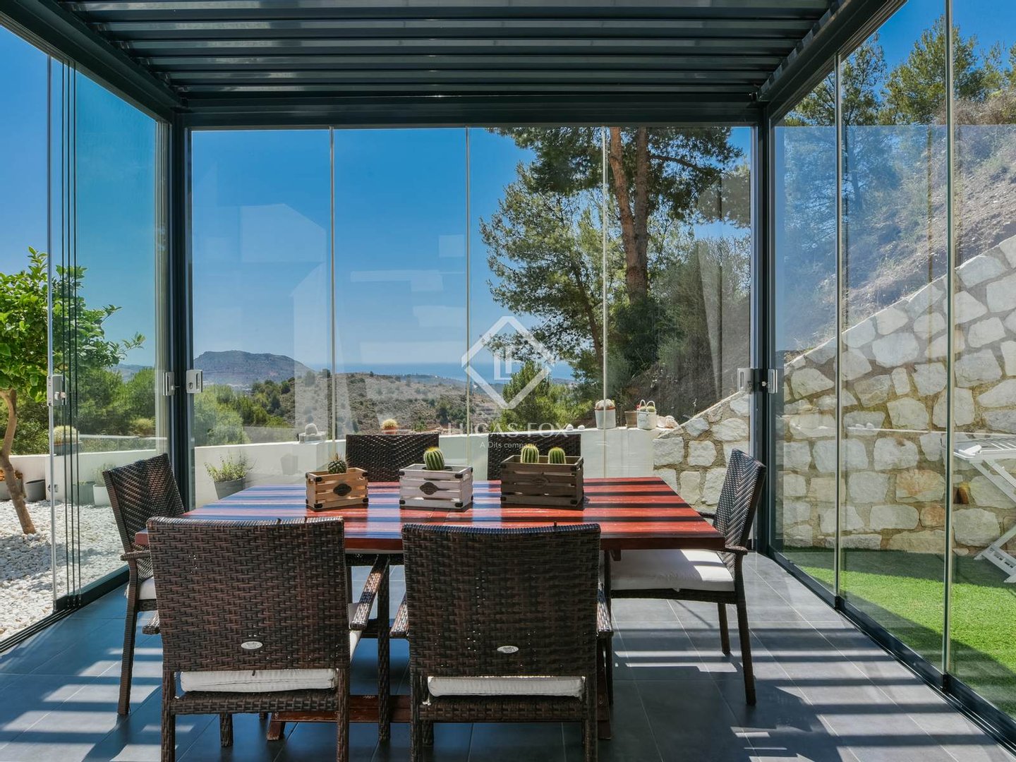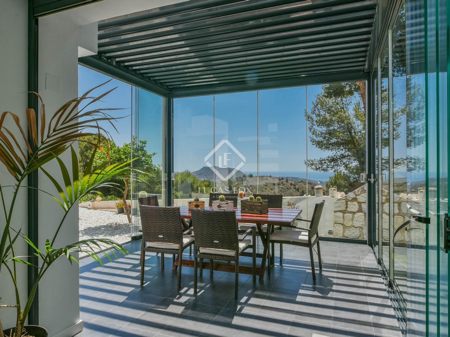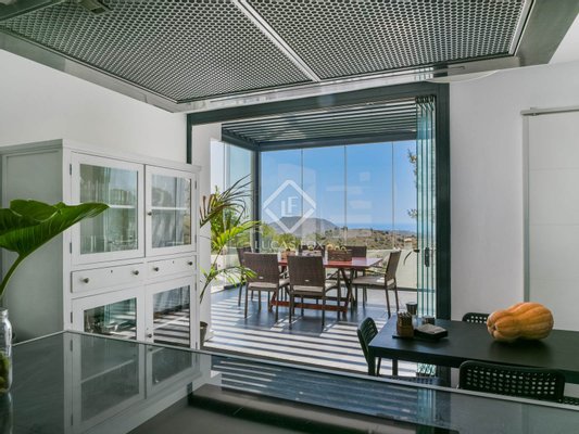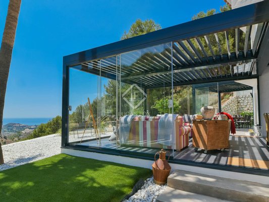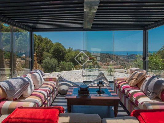Die wahre Seele des Anwesens sind die beiden verglasten Veranden mit mobilen und bioklimatischen Dächern mit Zugang vom Wohnzimmer und von der Küche. Sie genießen einen Blick auf das Meer und sind nach Osten ausgerichtet, sodass Sie die wunderschönen Sonnenaufgänge über dem Mittelmeer beobachten können. Da sie an drei Seiten Fenster haben, bieten sie nicht nur diese Aussichten, sondern bieten auch Geräumigkeit und Integration in die Umgebung, da sie vollständig geöffnet werden können.