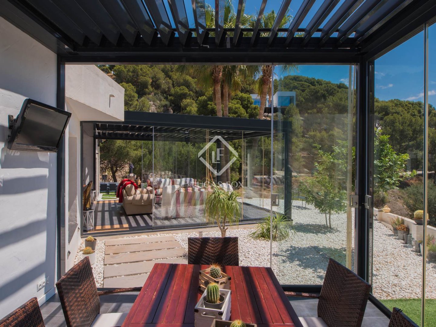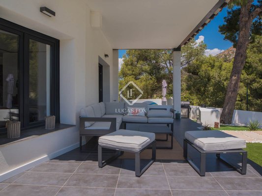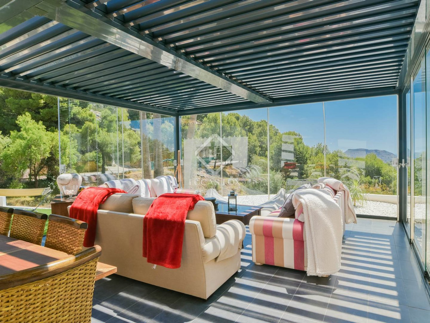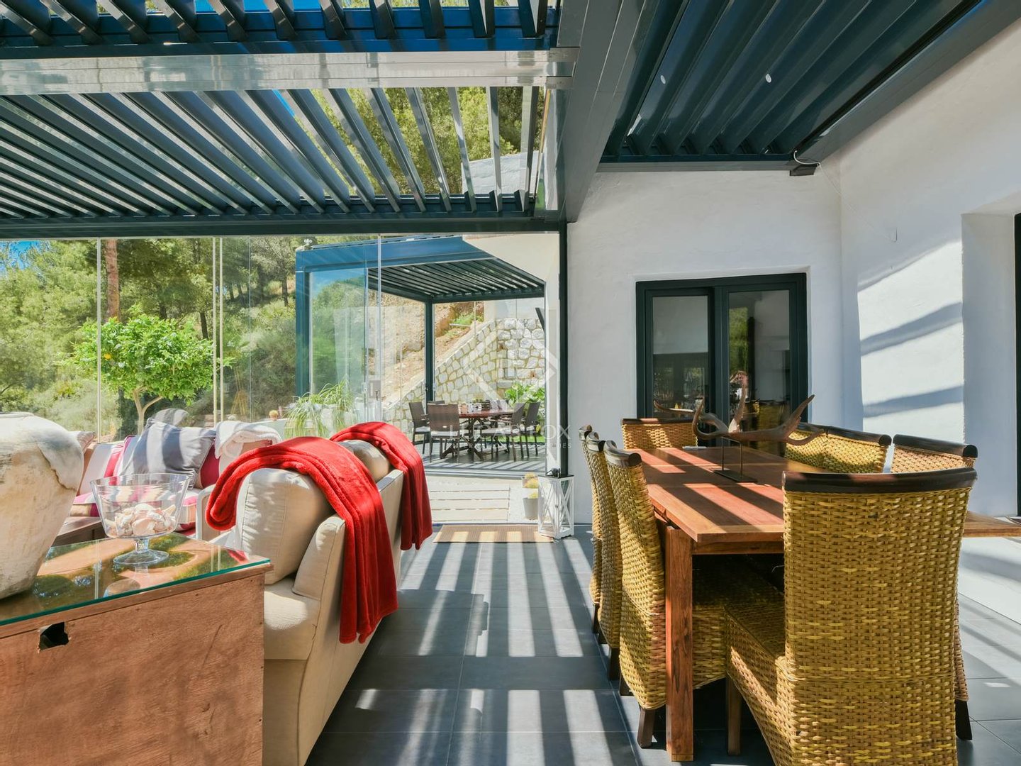 Die wahre Seele des Anwesens sind die beiden verglasten Veranden mit mobilen und bioklimatischen Dächern mit Zugang vom Wohnzimmer und von der Küche. Sie genießen einen Blick auf das Meer und sind nach Osten ausgerichtet, sodass Sie die wunderschönen Sonnenaufgänge über dem Mittelmeer beobachten können. Da sie an drei Seiten Fenster haben, bieten sie nicht nur diese Aussichten, sondern bieten auch Geräumigkeit und Integration in die Umgebung, da sie vollständig geöffnet werden können.