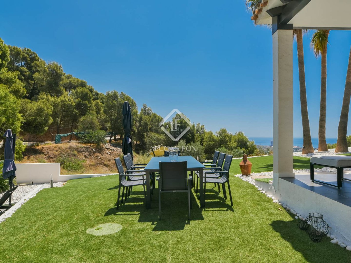 Der Gartenbereich hat eine Fläche von ca. 300 m², mit alten Bäumen und Palmen und wobei der gesamte Bereich mit hochwertigem Kunstrasen und weißem Stein ausgestattet ist, was einen geringen Pflegeaufwand ermöglicht und gleichzeitig ein elegantes Image verleiht.